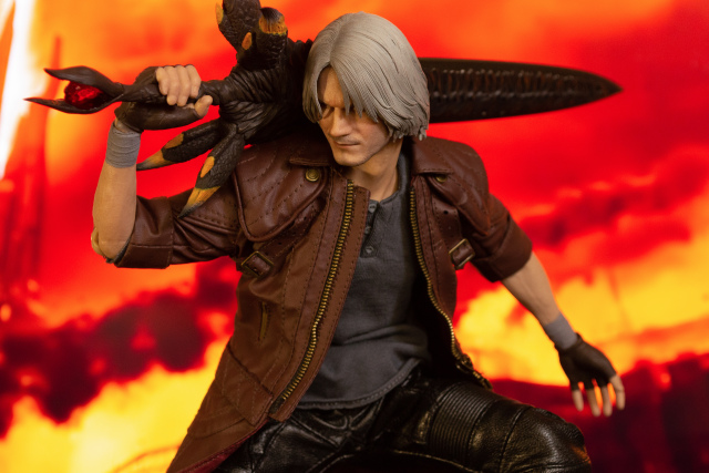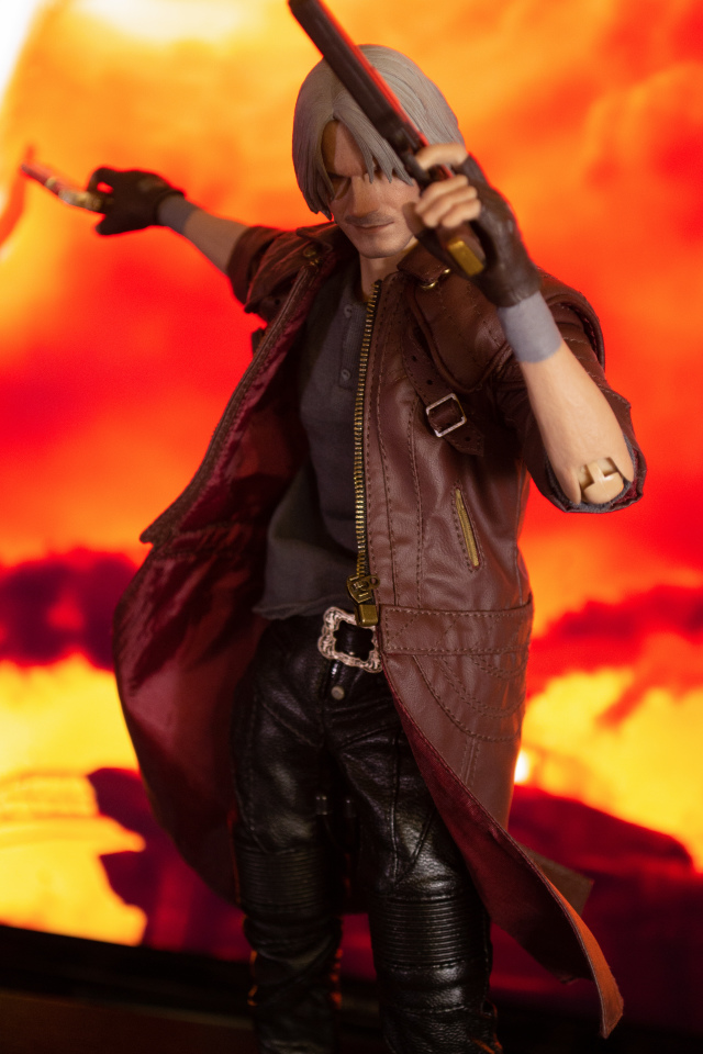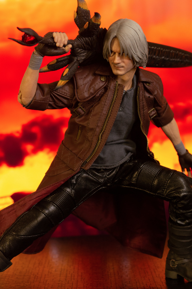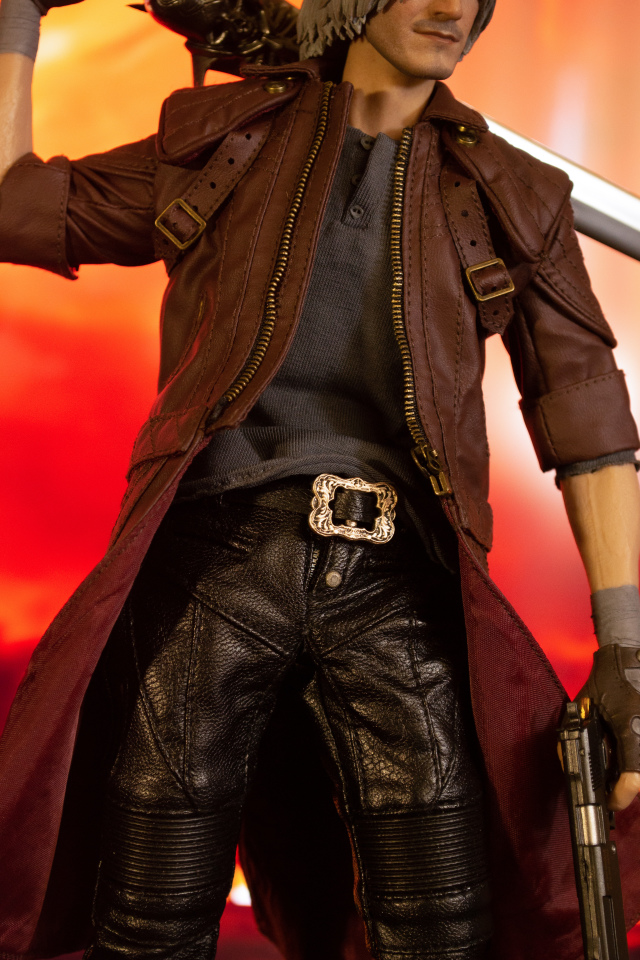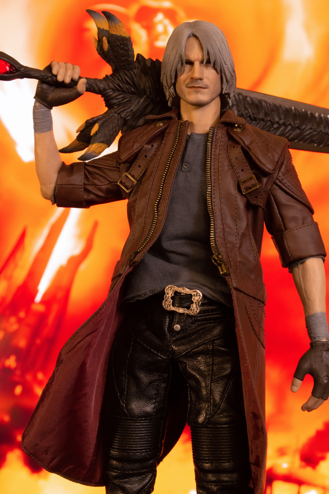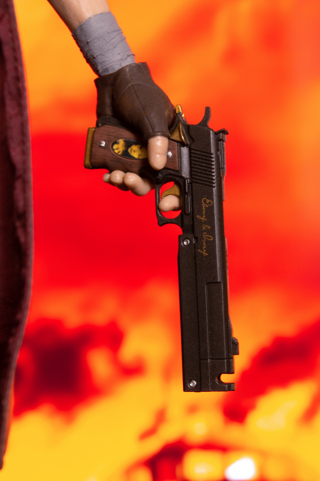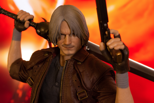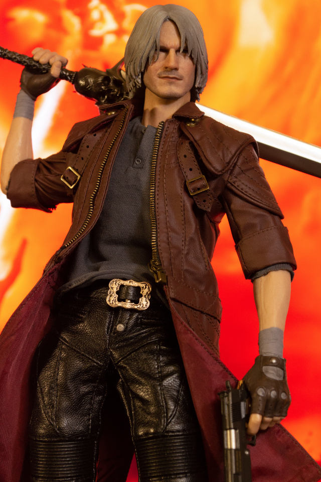 話說當初遊戲宣傳影片出來的時候丁叔好像引起不小的討論,有人嫌他變太老,而我個人是超喜歡鬍渣大叔啊,所以知道Asmus要推出五代但丁的時候我真的是非常的期待。不過他們尼祿發貨的時候我真的有點嚇到,那面癱真是嚇死我。慶幸的是但丁的頭雕個人覺得做得非常的成功,完全有抓到丁叔放蕩不羈的銳利神韻。