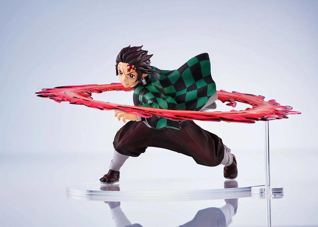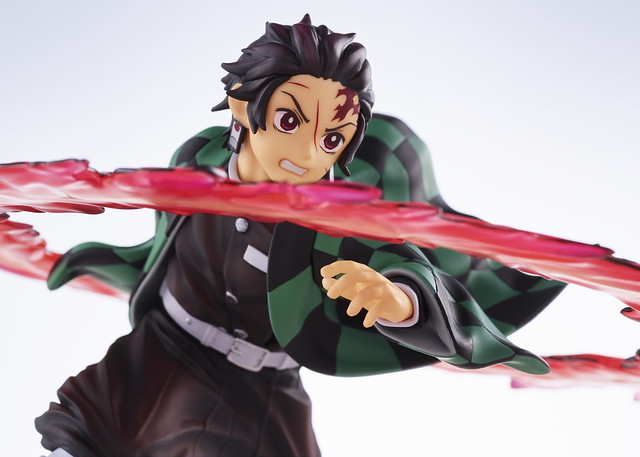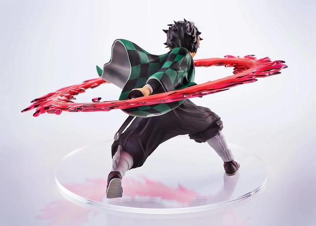 充滿躍動感的向前揮刀姿態搭配以透明材質打造的火之神神樂火焰特效,讓整體架式十足!除了還原炭治郎咬牙戰鬥的表情與臉上的傷痕,在飄揚起的市松紋羽織之下,還可以看見鬼殺隊服背後的「滅」字,造型相當精緻~