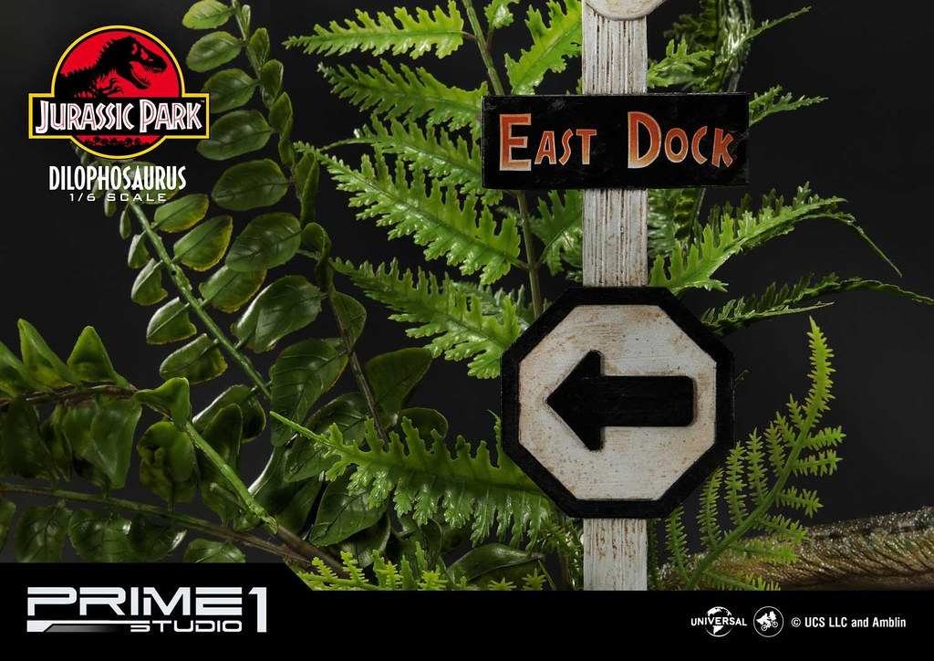 即使我們神通廣大的「丹尼斯·納德利」可以偷走稀有的恐龍胚胎、癱瘓樂園運作,最後還是栽在這隻雙冠龍的毒液之下:D~本作即是根據雙冠龍張開頸傘的造型製作,不管是體表的紋理、軀體的肌肉線條、極具生物感的漸層色,還是凝視獵物的眼神都十分細緻!小路場景也重現了劇中因大雨滂沱而泥濘不堪的土地與植物,而且還把當時劇中的經典要素:前往 East Dock 的路標、裝有恐龍胚胎的特製 Barbasol 刮鬍泡罐也一併製作了出來,Bonus 則是仿石碑質感的雙冠龍名牌台座。竟然不是被毒液噴到的胖子納德利,扣分