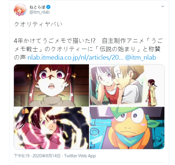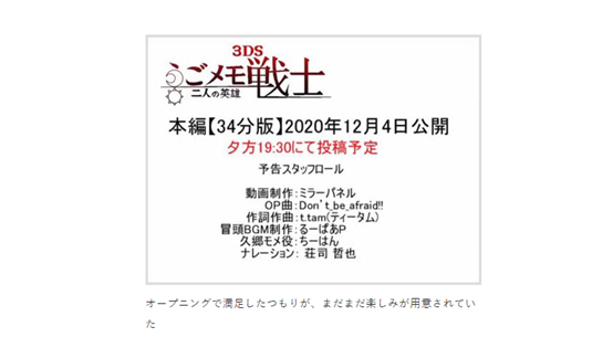 完整作品預計於2020年12月4日晚上7:30於「NICO動畫」和YouTube平台公開,原創的《うごメモ戦士》(移動筆記戰士-兩人的英雄)共計34分鐘,而這已經不是該位藝術創作者首次作品,早在2014年便能循跡其熱忱。