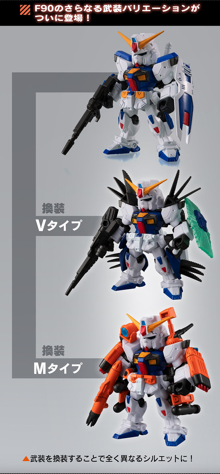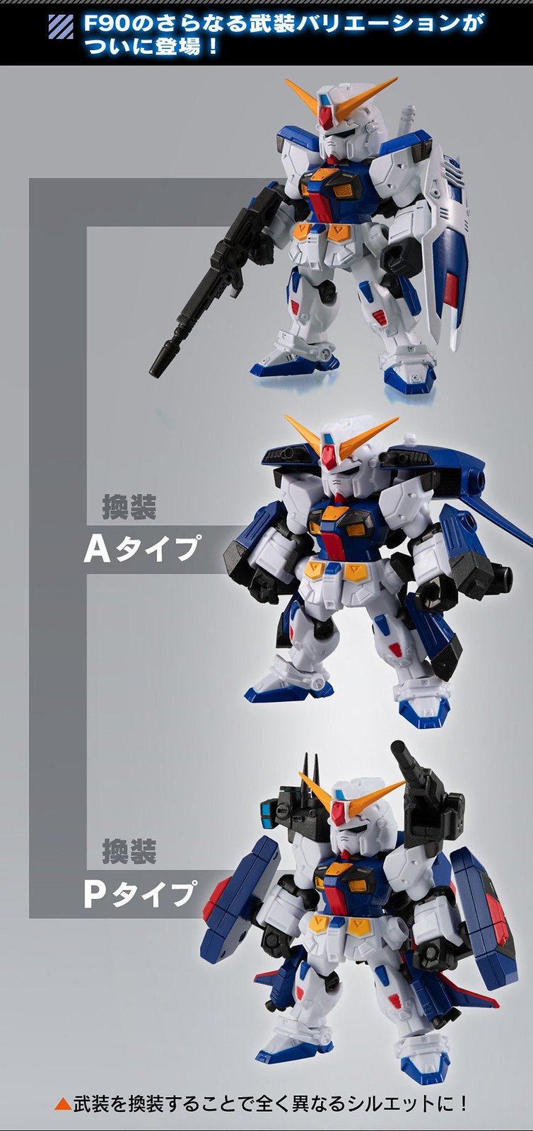 由日本萬代玩具公司轉蛋事業部 GASHAPON 發行,以共同接點、無限換裝為特色的《機動戰士鋼彈》重裝 X 重奏轉蛋玩具『MOBILE SUIT ENSEMBLE』系列今(16)日公開兩款 EX 彈商品「EX24 鋼彈 F90(A・P裝備)」、「EX25 鋼彈 F90(M・V裝備)」預計於 2021 年 02 月發售的消息。