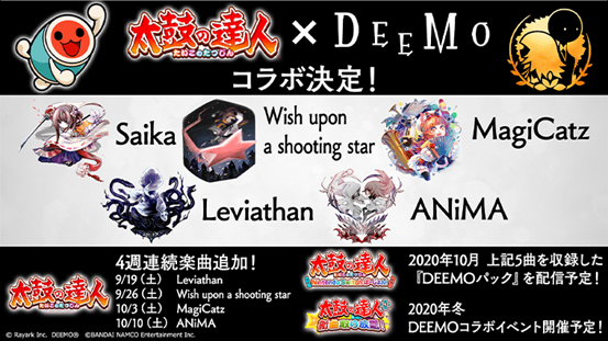萬代南夢宮的「太鼓達人」於官網發布合作消息,本次將與《DEEMO》音樂遊戲合作,並導入五首曲目《Saika》、《Leviathan》、《Wish upon a shooting star》、《MagiCatz》、《ANiMA》,以每周更新方式登場。