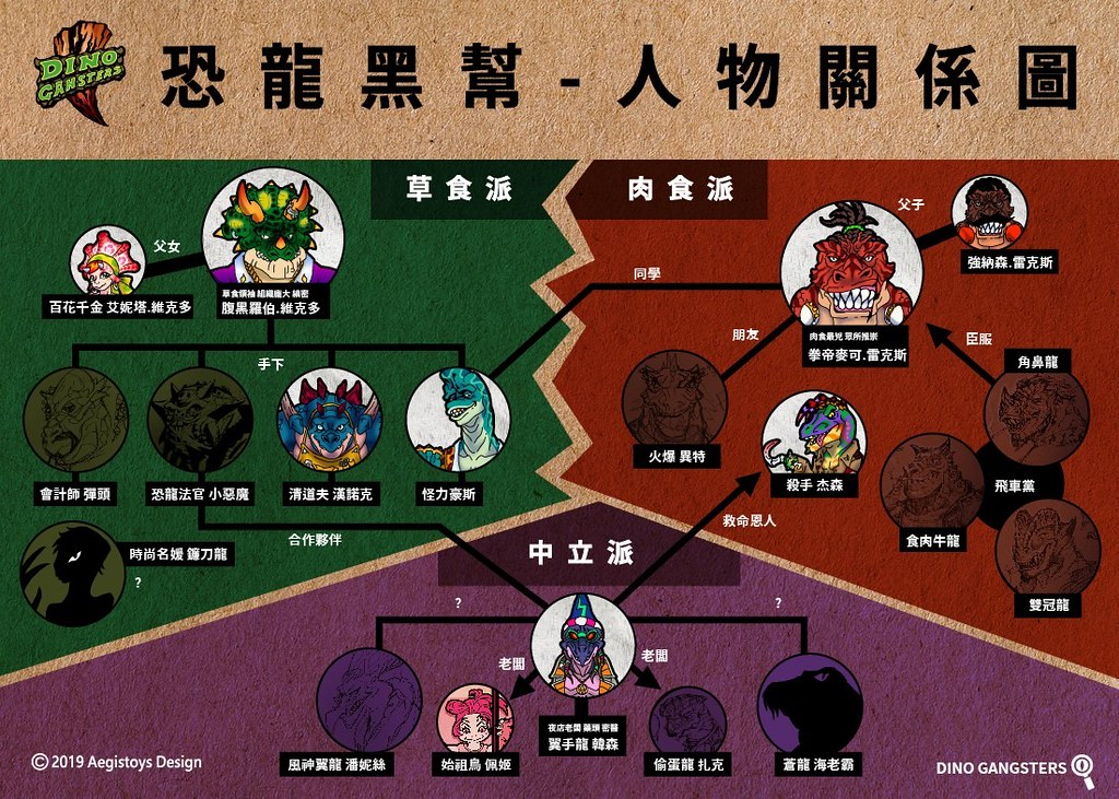將恐龍與幫派元素結合的設計師玩具系列「恐龍黑幫」,其帥氣造型、壯碩線條、搶眼穿搭所營造出來的硬派風格絕對令人過目不忘,草食派的三角龍老大-腹黑羅伯、肉食派的拳帝-麥可,以及中立派的夜店老闆兼藥頭-翼手龍韓森,加上酒保、殺手、恐龍法官......等各式各樣角色所交織出的世界觀真的非常迷人。