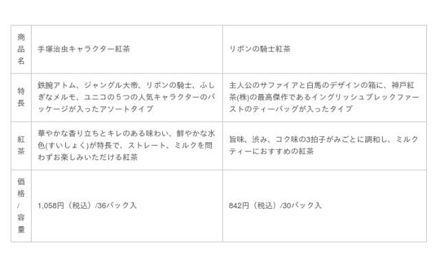 以《原子小金剛》、《小獅王》與 《緞帶騎士》《 ユニコ》與《神奇糖》做為茶包包裝視覺設計,「手塚治虫角色紅茶」由神戶紅茶的鑑定師將頂級皇家紅茶與汀布拉紅茶做結合,並散發出華麗的香氣和鮮明的味道,內含有36個茶包,價格為 1,058 日圓。