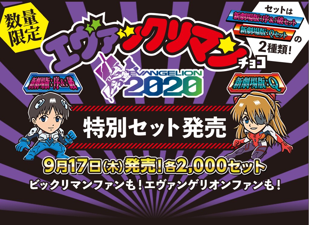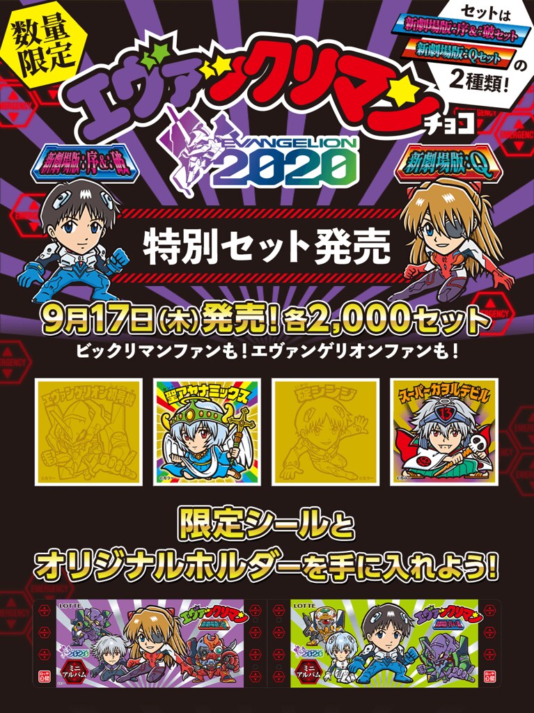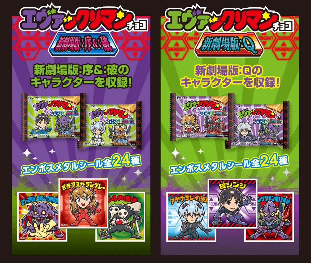 日本樂天 LOTTE 零食品牌所推出的經典「聖魔大戰」(ビックリマン/Bikkuriman)巧克力餅乾,在「聖魔大戰之日」驚奇企劃中發布過與《福音戰士新劇場版》聯名的相關消息,在「聖魔大戰 x《福音戰士新劇場版》」(エヴァンゲリオン×ビックリマン)的珍藏貼紙後,好評再推出「EVA聖魔大戰特別套裝」與海洋堂特製「超級宙斯真嗣 & EVA耶穌大力士初號機」的人偶抽獎活動,從 9 月 17 日起於日本LOTTE官方商店限定販售!