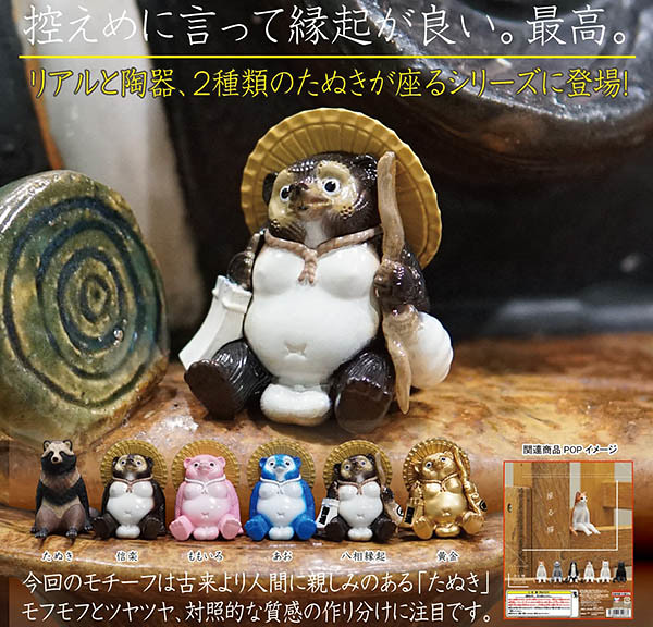 向來以動物為主題的「坐著系列」轉蛋,這次轉戰日本常見的招財開運神化動物「福狸太郎」(Tanuki),將頂著大大的肚子和巨大蛋蛋、象徵幸運之神的狸貓以擬人化的坐姿呈現,高度約 35 mm,以精緻可愛的造型加入雙腳伸長、靜靜坐著的行列~