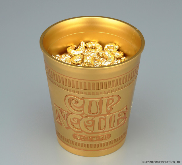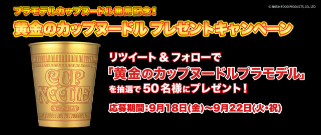 而日清食品與萬代為了紀念日清杯麵 1/1 組裝模型的發售,特別在今日推出了同樣也是日清杯麵 1/1 組裝模型的「黃金紀念版」抽獎活動,此時此刻,小編突然覺得聖杯算什麼,黃金日清杯麵才叫潮好嗎XD