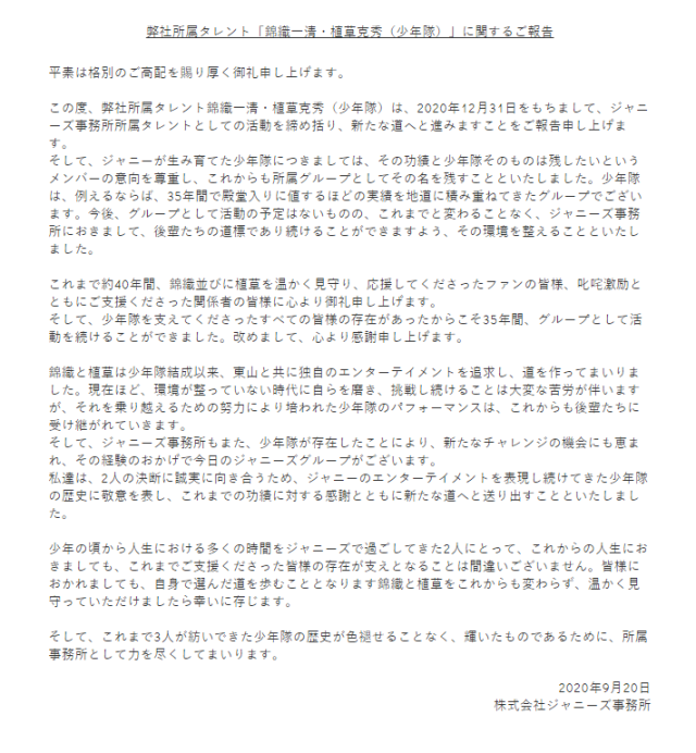 傑尼斯事務所官方表示,由於錦織一清與植草克秀另有人生計畫,因此尊重他們的意願,而將在今年年底後正式中止有關兩位少年隊成員的所有演藝活動,但儘管三名成員走到只剩下一人,傑尼斯事務所也以「單飛不解散」名義,將團名保留住。