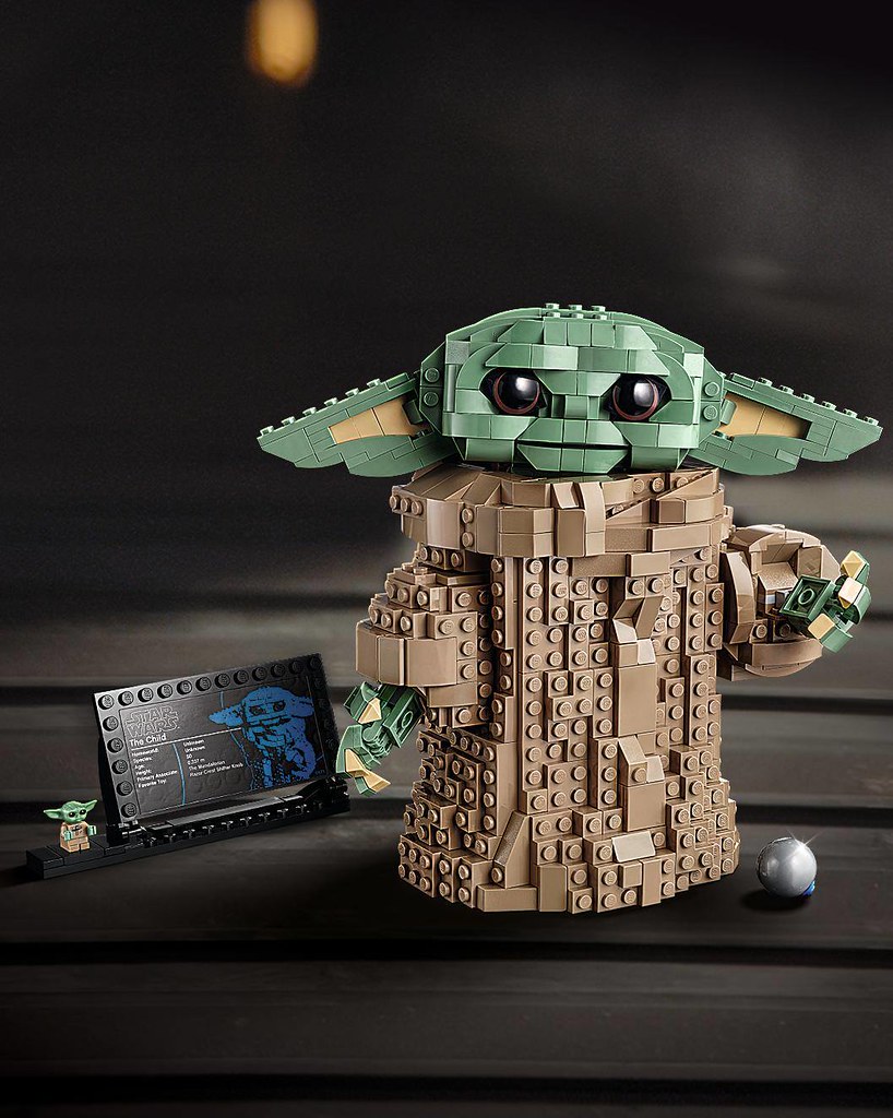 在《曼達洛人》的角色設定中,尤達寶寶 The Child 高約 16 吋(約 40.5 公分),而本次的樂高模型高約 19 公分,基本上可以說是 1/2 的比例,總共用上 1073 片零件完成,與劇中造型比起來,頭型感覺較為寬短,但高度再現了尖尖的大耳,斗篷在部分位置用上多個弧面、斜面與平面磚,打造出皺摺與層次感,而在脖子、耳朵、左手還設置了可動機構,加上本作附上的銀色圓球,就能還原尤達寶寶正在把玩操縱桿圓球的造型!