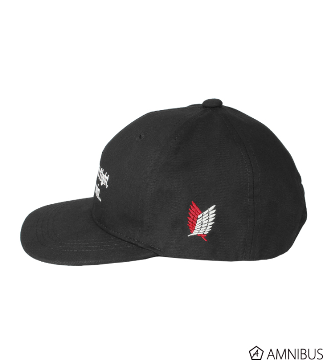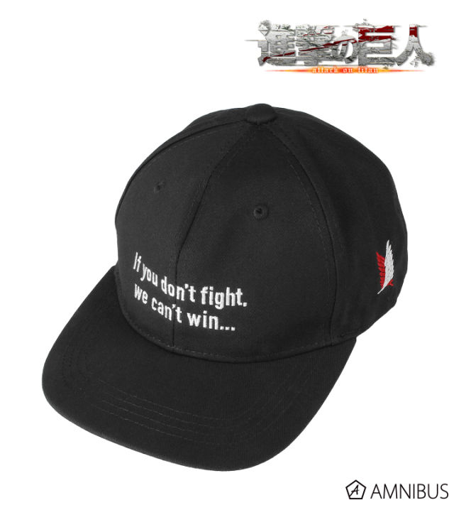 帽子刺繡上艾連與李維的經典台詞,艾連款為 : 「戰鬥啊!快戰鬥啊!贏不了就會死!贏了就能活下去!」,李維則是 : 「 只能選擇自己不會後悔的路。」帽子側邊繡上象徵自由之翼的調查兵團與艾連跟李維各別的英文名。
