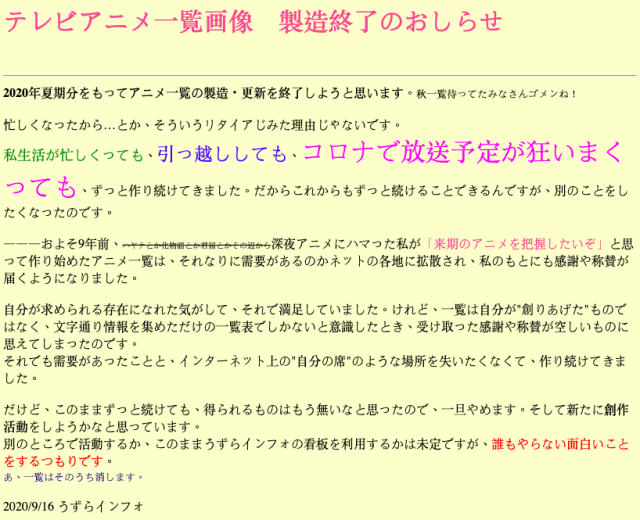 然而在 9 月 15 日時,一直在持續製作這個每季新番表的うずらインフォ推主本人卻表示:「我決定不再繼續製作動畫新番一覽表了,打算去做點以往都沒做過的嶄新事情。對正在等待著秋季十月新番的各位說聲抱歉!」