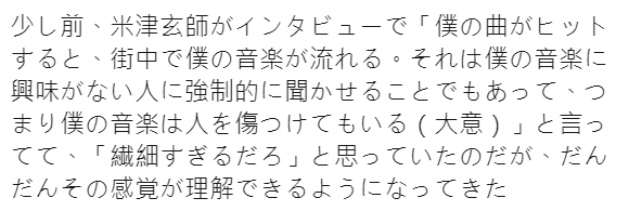 ▼米津曾在訪談中說明"自己的歌曲在城市中播放傷害了他人"