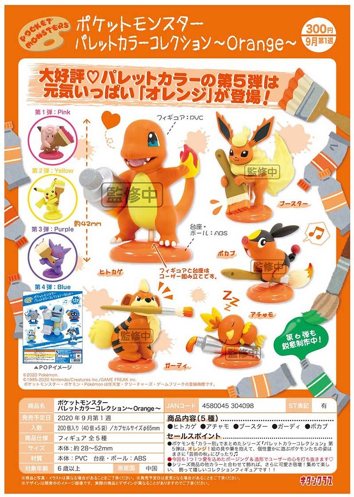 日本奇譚俱樂部公司(株式会社奇譚クラブ),以人氣動畫《精靈寶可夢》為題材發行的「調色板顏色收集」系列,繼好評的粉紅色與黃色、紫色與藍色後,又將推出第五彈續作:「《精靈寶可夢》調色盤顏色收集 ~橘色~」轉蛋作品(パレットカラーコレクション~ORANGE~),一共五種款式,一轉參考售價為 300 日圓,原訂將於 2020 年 9 月發售(目前因疫情影響而延後推出)