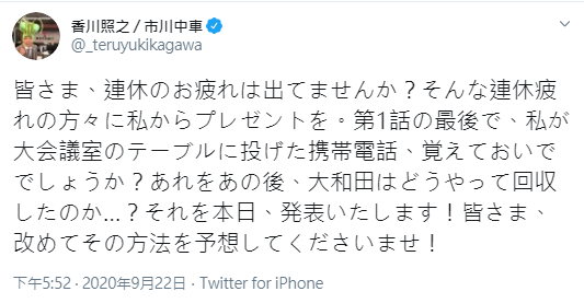 7月首播的《半澤直樹2》得到22%收視亮眼成績,在第一集中飾演大和田曉的香川照之在劇情中展現城府的演技:「半澤開始行動了嗎,感謝你告訴我。」隨後憤慨將手機一扔,滾到董事會大桌中央,引起網友議論紛紛:「接下來要怎麼拿手機?」,而這個熱議已久的話題不斷發酵,終於在演員香川照之的推特中揭曉答案,還曝光「珍貴畫面」。