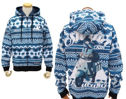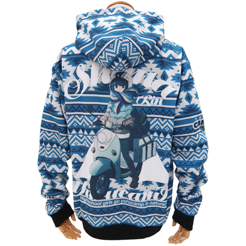 滿版的圖騰配上志摩凜的色系-藍色,具有寒冬的氣息。正面胸口兩側附上搖曳露營的Logo,右手臂也有小小 Q 版的人物圖像。背後輔以一個巨大騎著速克達的志摩凜,超級可愛啦 XD。