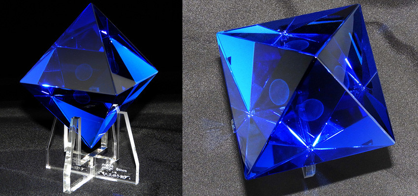 「第六使徒 Ver.2」玻璃工藝品,由北海道小樽百年名店「大正硝子館」匠人手工打造的水晶玻璃呈現,還原第六使徒的藍色正八面體外觀,更在水晶玻璃內部透過雷射加工,打造出第六使徒的圓形狀核心,並附有透明的展示架,可以各角度盡情欣賞通透而晶亮的第六使徒!