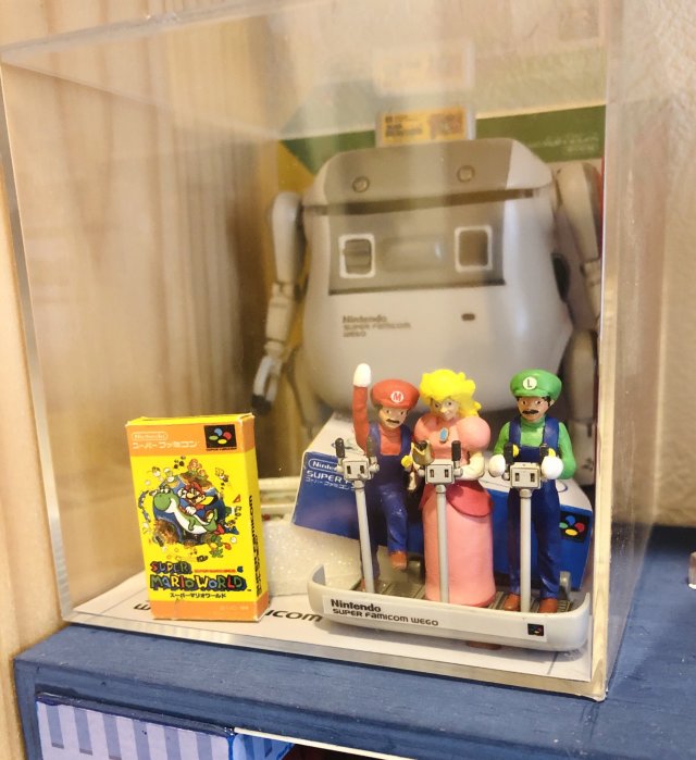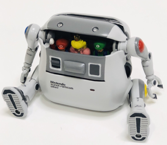 超級任天堂以メカトロウィーゴ進行改造,頭頂的部分不僅成為了遊戲機的卡匣,正面開口處的裏頭還特別放進了任天堂當家電玩明星瑪利歐、路易吉與碧姬公主,視覺上整體看起來是相當的可愛。