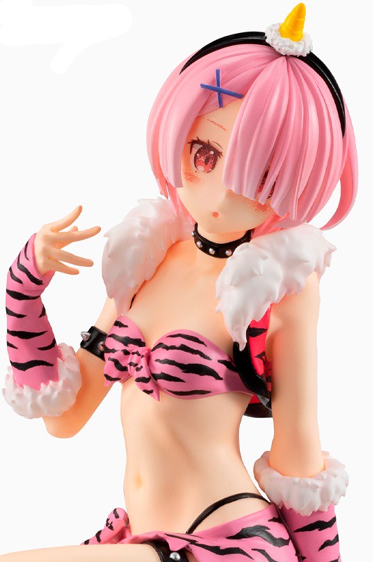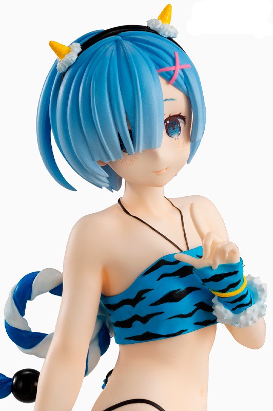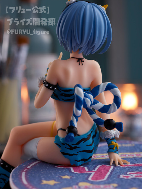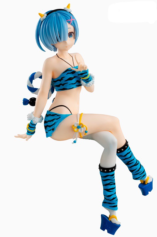 水藍色的雷姆,變成「青鬼」造型,特徵的虎皮衣裝也變成性感的模樣,頭上帶著青鬼兩隻角的髮箍,翹著腳幫你壓泡麵蓋~