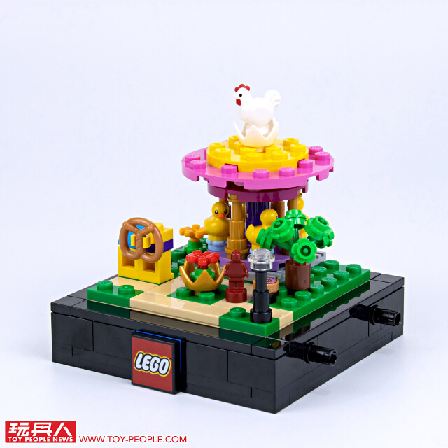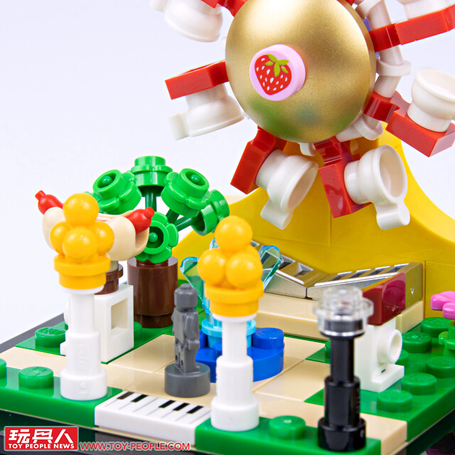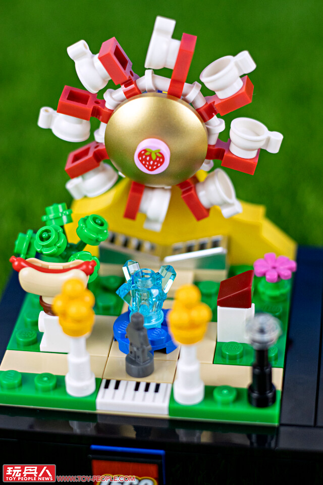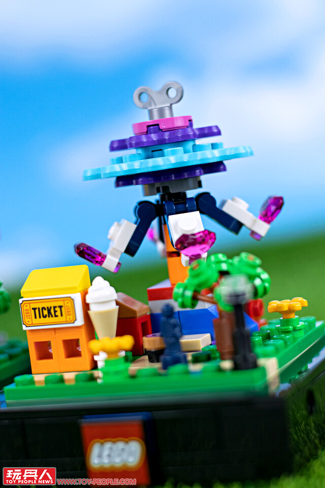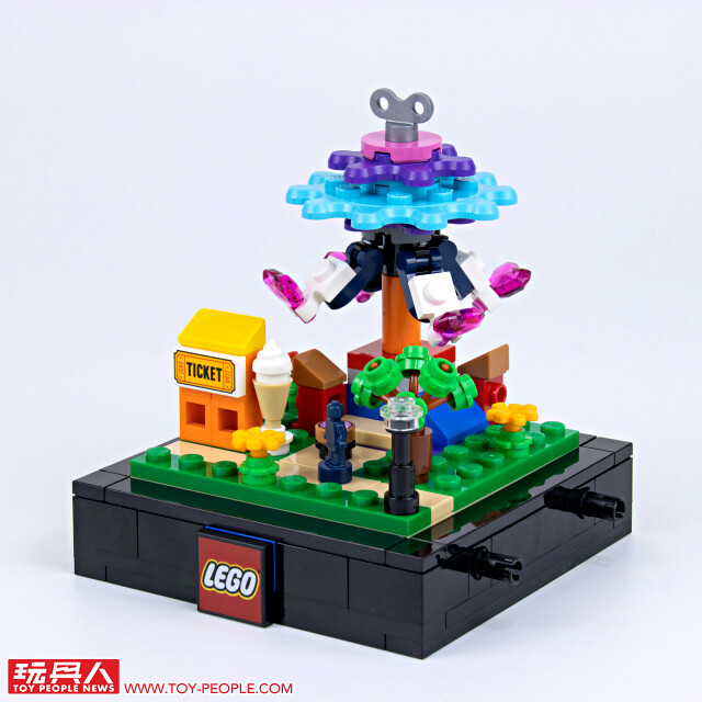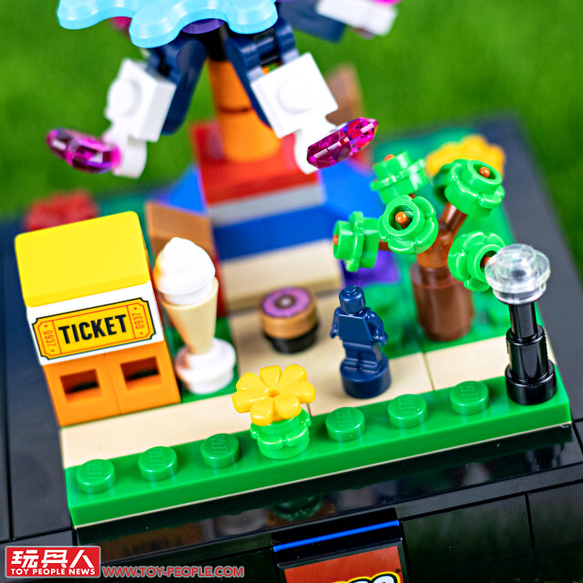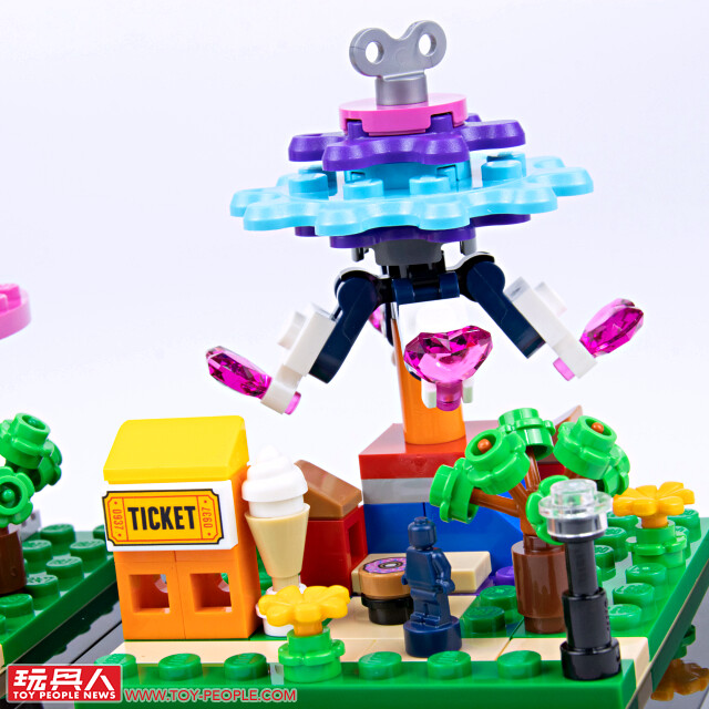 最後的旋轉鞦韆在配色上是最貼近「LEGO Friends」系列的一個,座椅部分採用桃紅色的彩透愛心零件,有點夢幻啊~一旁還做出了售票亭,這一款的遊樂園美食是小朋友最愛的冰淇淋了。