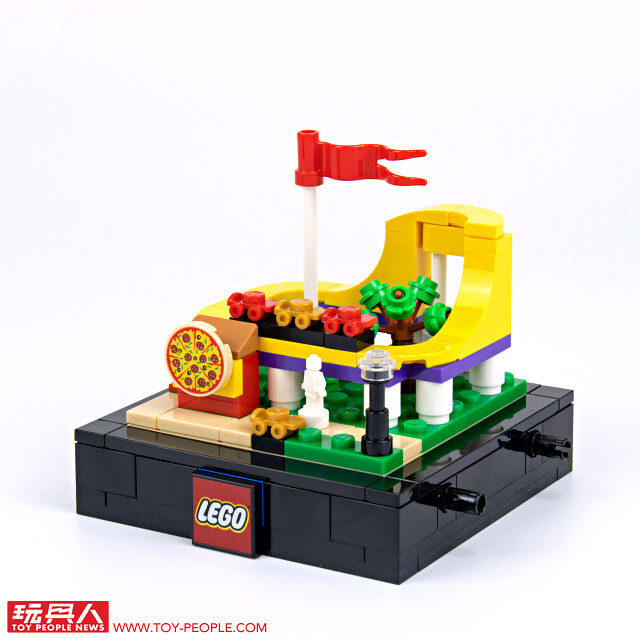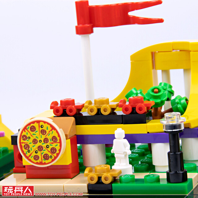 接著是有架設黃色軌道的雲霄飛車,用上人偶溜冰鞋、或是可以當玩具小車子的零件作為車廂,而這組的遊樂園必備美食是披薩。