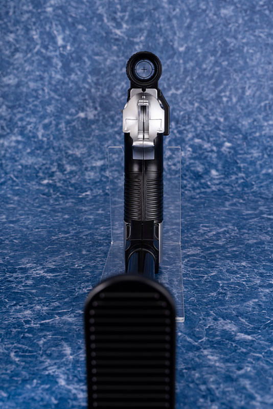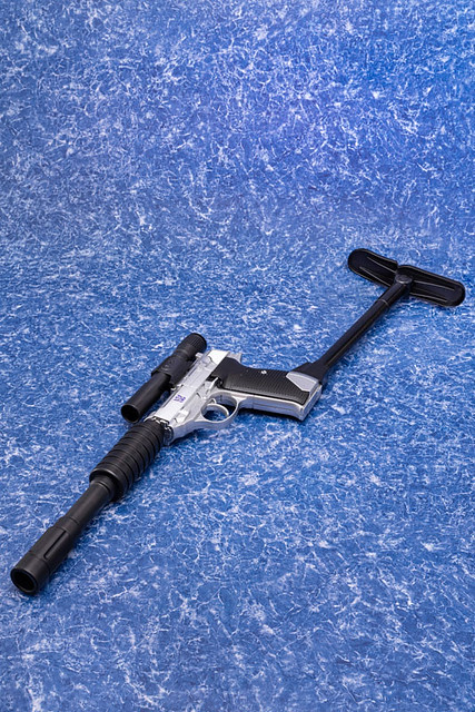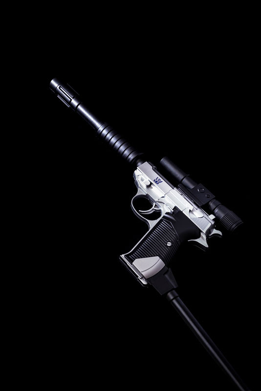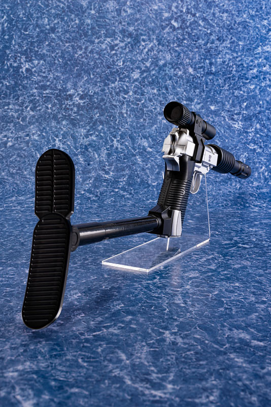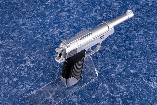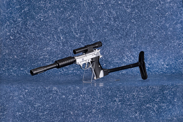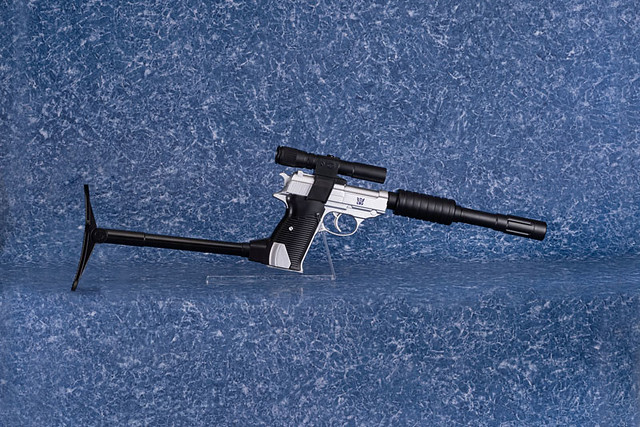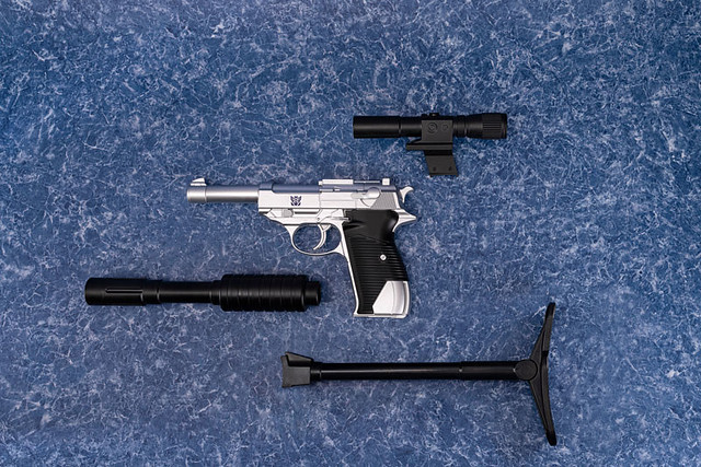 這款 DAIKI 大氣工業推出的密卡登造型水槍,將密卡登變身為手槍狀態的模樣完美複製,外型看上去與 P38 手槍幾乎無異,銀灰色外觀呈現高度質感,槍身上紫色的狂派標誌當然不可少。另外也附屬專門給槍使用的配件,包含了狙擊鏡、延長槍管,以及穩定用的槍托,全部裝上去之後整體長度來到 62.5 公分,更顯得其威力與魄力滿分。