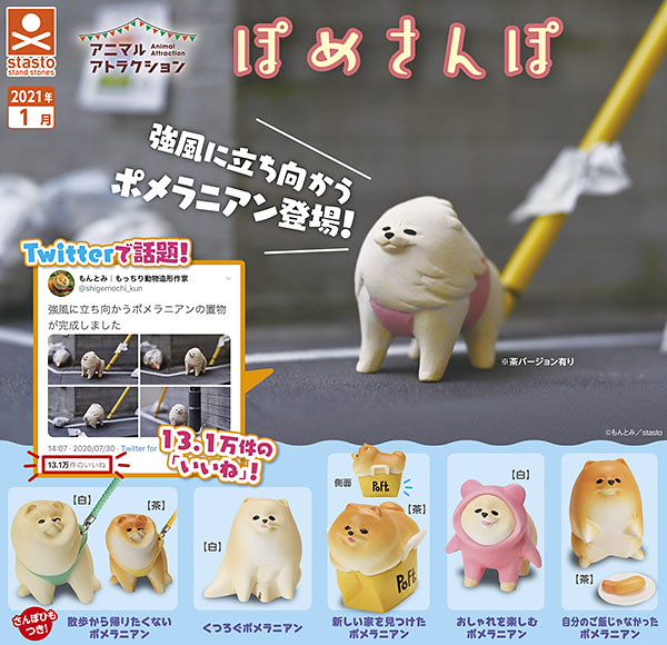 以散步時賴著不回家的狗狗為設計,在社群網站爆紅的「散步系列」,這次由狐狸犬家族中最小的犬種「博美犬」為主角,每款尺寸全高約30~45mm,收錄有超可愛的:面對強風的博美(白/茶色)、散步不想回家的博美(白/茶)、放鬆的博美(白)、發現新窩的博美(茶)、享受時尚的博美(白)、這不是我的飯 博美(茶),每一款都相當爆笑可愛,蓬鬆的樣子萌翻人啦~狗派的玩具人,快把他們帶回家吧!