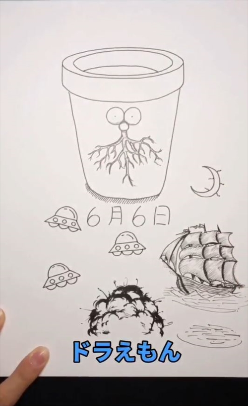 推主黒主くん(@gen_titi_1827)明明是聽著這首歌照著畫哆啦A夢的,但怎麼畫出來卻是各種雜七雜八的怪東西混在一起,感覺就像是剛夢醒的人才會畫出來的景象,原本歌詞一開始是從眼睛開始畫,「まるかいて ちょん」翻過來就是指畫一個圓然後一點,因為眼睛有兩顆所以唱兩次,等眼睛畫好後,後面就完全混亂了,究竟是歌詞太過抽象還是推主的腦迴路實在跟不上呢,小編無法得知啊。