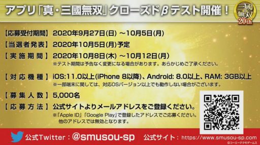 而官方宣布將在 9 月 27 日至 10 月 5 日期間可以參加手機遊戲《真・三國無雙》Beta 封閉測試的抽獎資格,並將只會有 5000 人可以參加此封測的資格,抽獎結果將在 10 月 5 日公布。並將於 10 月 8 日至 10 月 12 日開放 Beta 封閉測試。報名玩家手機須在Android 8.0以上、iOS 11.0以上,且記憶體需 3GB 以上,才能夠參加此次的封測。