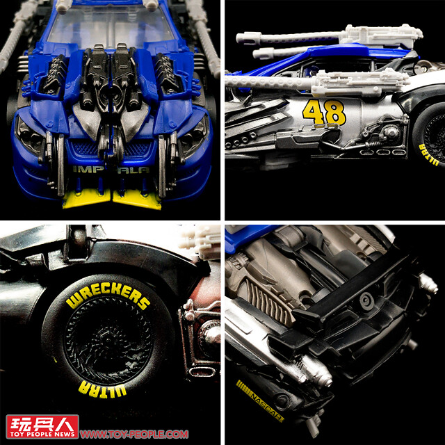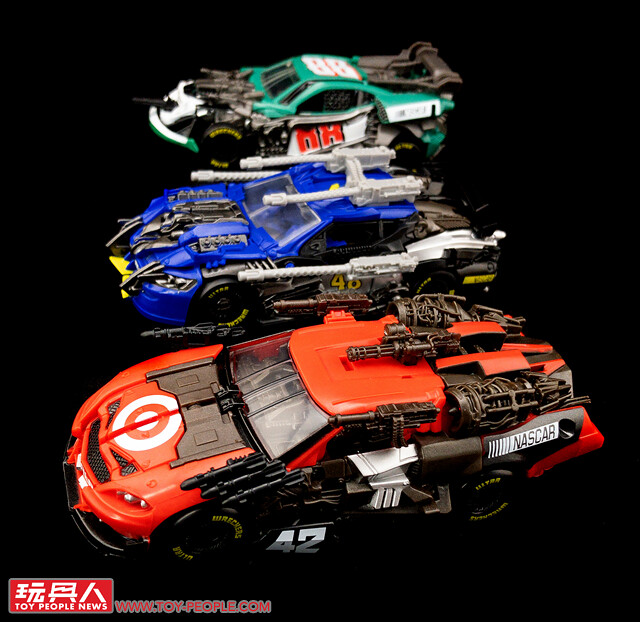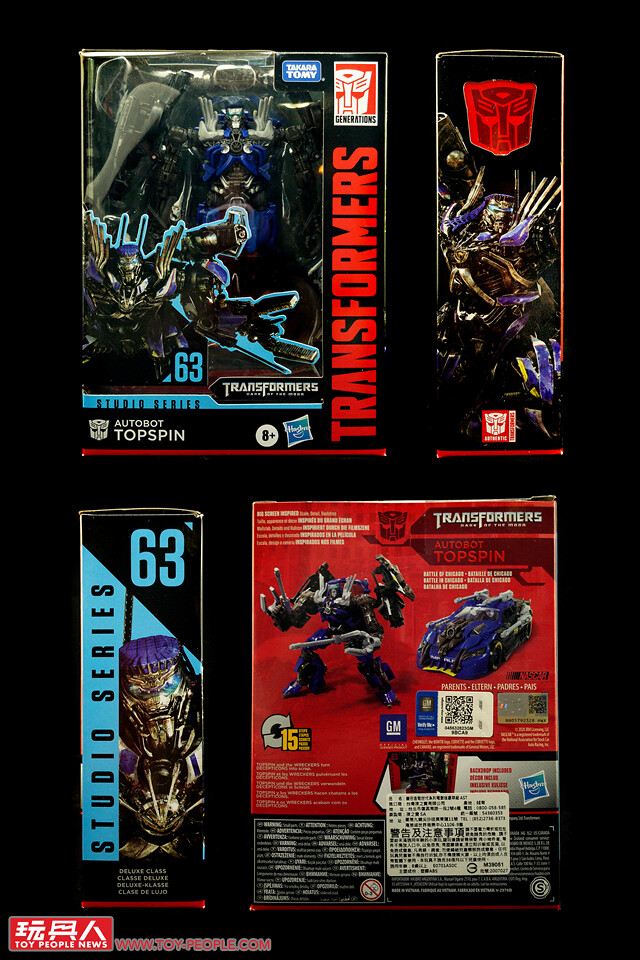 ▼ No. 63「上旋」(Topspin),取材自2011年的《變形金剛3》(Transformers: Dark of the Moon),與路霸(Roadbuster)和鉛腿(Leadfoot)成博派的技師小隊(Wreckers),共同負責太空梭蒼耳號(Xantium)的維護,可變形為賽車手吉米·強森(Jimmie Johnson)的48號武裝化NASCAR改裝雪佛蘭Impala。盒背處可見NASCAR及通用汽車(GM)的授權貼紙,車型的還原度讓人相當期待。
