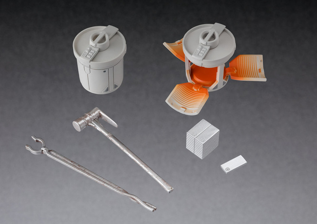 「S.H.Figuarts The Armorer」高約 15 公分,以 ABS、PVC 再現了這位替族人打造、修復盔甲的「軍械員」在劇中的造型,帶有五根尖角的金色曼達洛頭盔、褐色胸甲、格紋肩甲、披肩、皮裙......等皆細緻地刻畫,腰帶上的豐沛細節更是沒有放過,而手臂、腿部的服裝皺摺也充分形塑,但最讚的還是 The Armorer 附有的配件,包含貝斯卡鋼(單片與堆疊兩種)、收納貝斯卡鋼的容器「坎托諾(Camtono)」(有打開與闔上兩種狀態)、火鉗、錘子,與身穿貝斯卡裝甲的曼達洛人一起把玩出更多劇中場景吧!