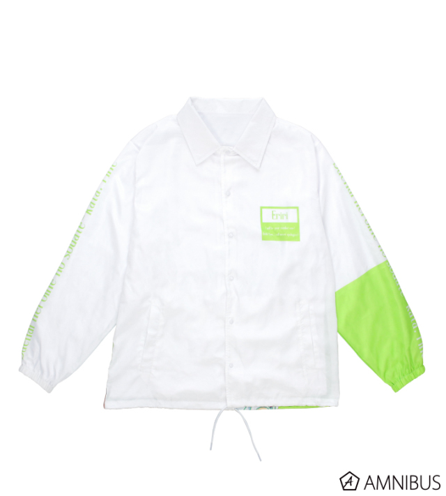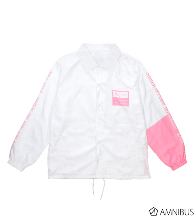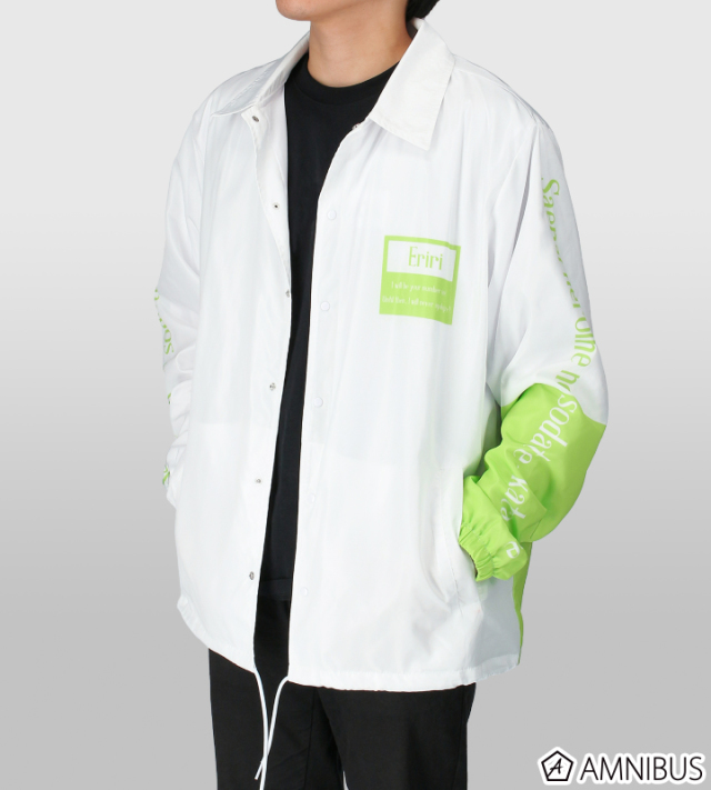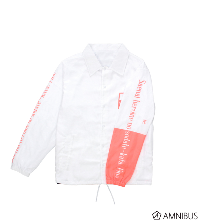 以教練外套的版型設計,正面有著各角色的英文名字,兩手手臂上則有《不起眼女主角培育法 Fine》的英文名稱,以不對稱的色塊配置讓白色的外套略顯不同。最引人注目的就是背後的女角了,以 AMINIUS 自豪的 Ani-Art 繪圖系列,讓美美的三位女角活現在外套上,色彩的繽紛讓人更多添一種夢幻的氛圍。