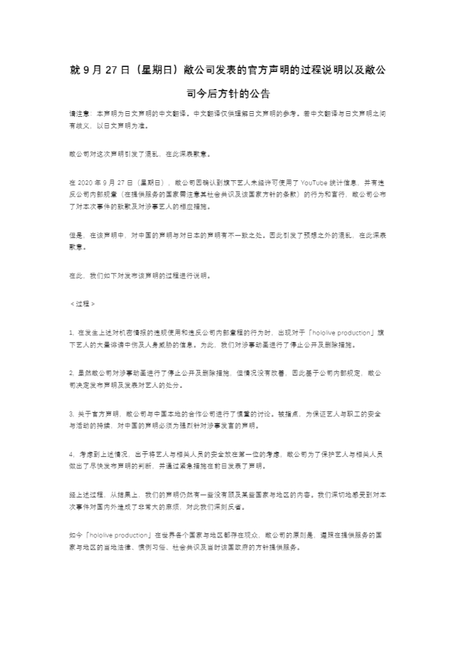 眼看大火持續延燒的COVER,又再度於官網以及中國影音平台bilibili發布第二則聲明,內容表示因此事件讓自家VTuber收到太多誹謗、人身攻擊騷擾等訊息,公司為了保護旗下藝人才選擇做出道歉聲明與處分,而對於之後所引起騷動也感到十分抱歉。