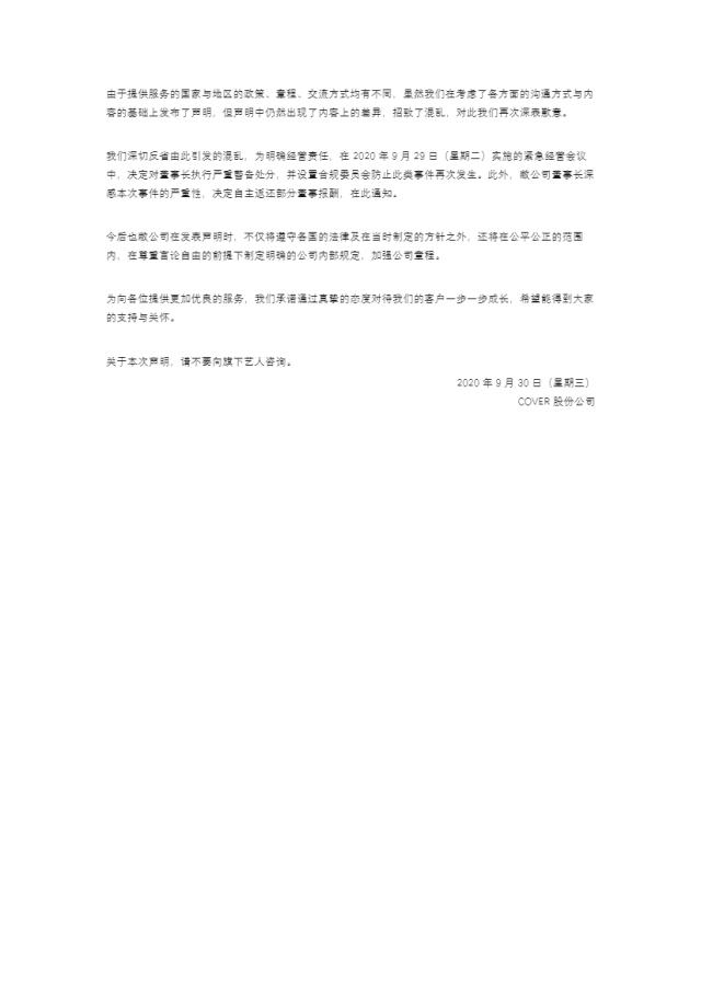 最後COVER也表示,對於這次的事件,將會對該公司董事長給予處分,並且成立委員會來防止類似事件再次發生,而COVER董事長也決定自主繳回部分酬勞來作為懲處。