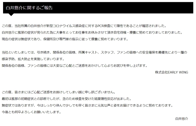 這次,本公司所屬的白井悠介對新型冠狀病毒感染症的PCR檢查確認為陽性。因為白井悠介出現了感冒的症狀,所以為了身體著想,就讓他所有手邊的工作都先暫停,並努力在家裡待命、療養。雖然現在檢查出來的結果為陽性無症狀,但我們依舊按照保健所和專家的指示來進行療養。