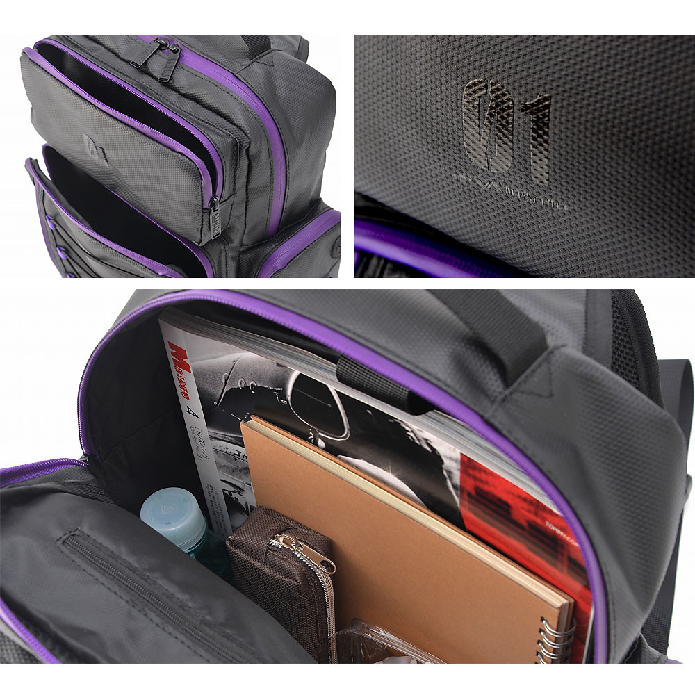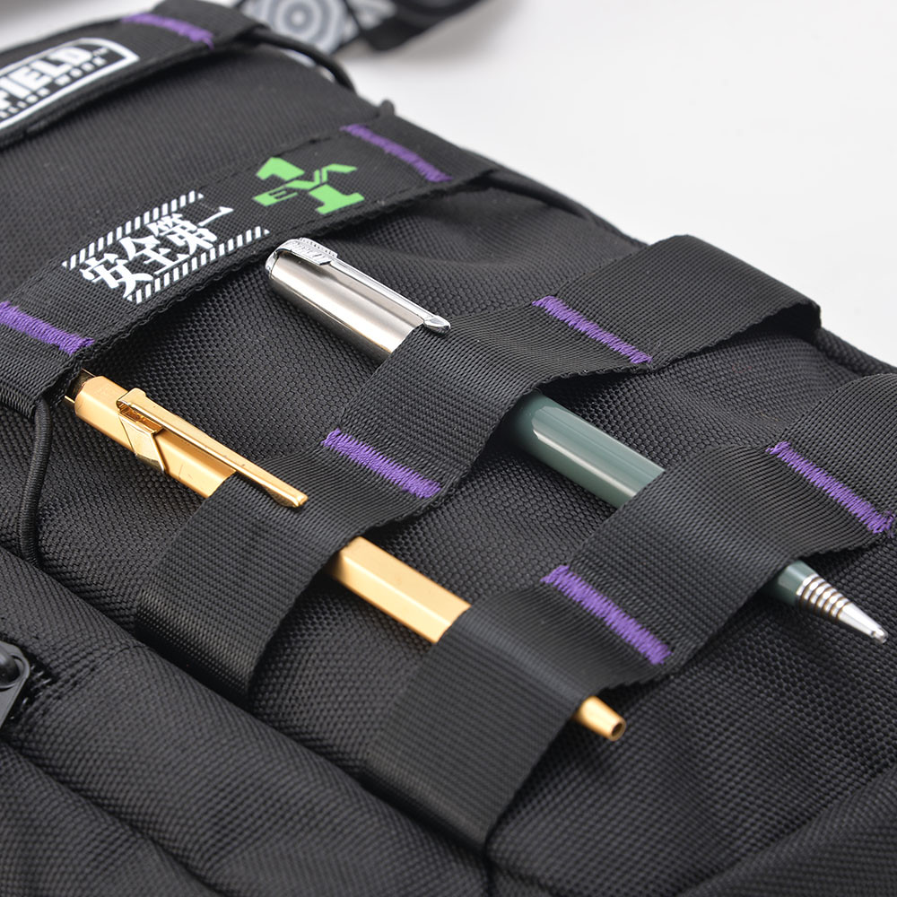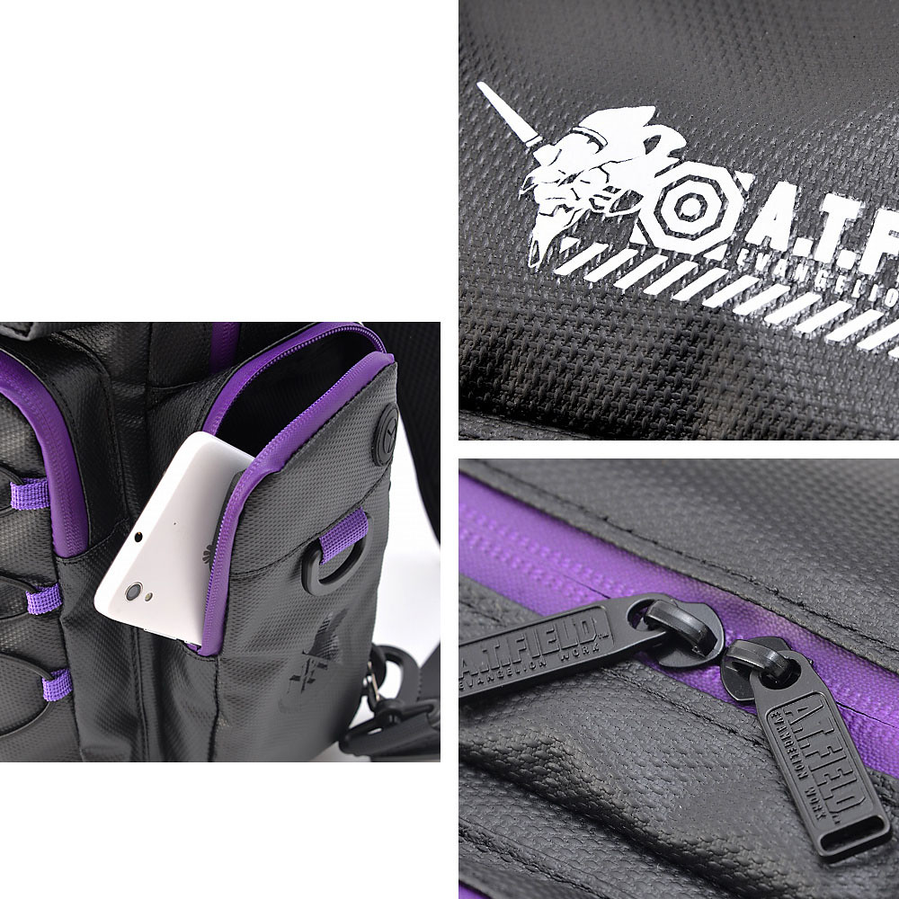 同樣為初號機、貳號機兩款紫、紅設計概念,並有A.T.FIELD、01、02等標誌。背部透氣網孔與安全扣設計舒適好穿戴;擁有主袋與前袋多種收納空間,雙拉鍊方便好拿取,背袋可以調整多種背法,一包多用途。