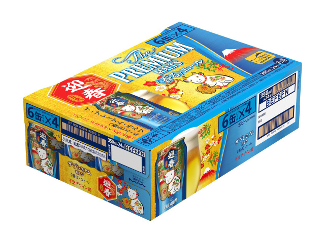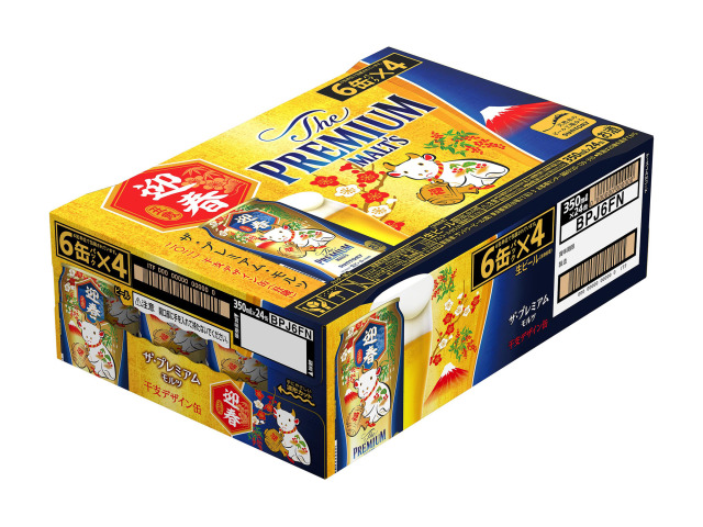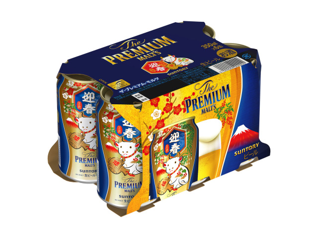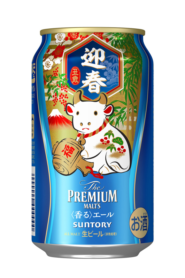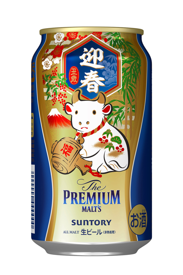 三得利頂級啤酒 The PREMIUM MALT'S 系列,以綿密的氣泡與獨特香氣的生啤酒得到不少喜愛。經典瓶罐放上「 迎春」字樣,以及富有正月新年氣息的牛牛插圖,配上紅色的富士山與梅花,超級可愛的啦!