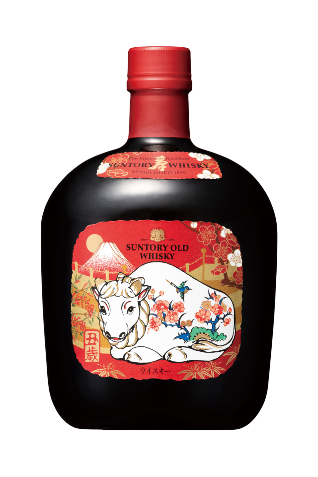 三得利老威士忌則以經典瓶裝,標籤上有著與皇家威士忌的牛造型相同的繪圖,紅色的瓶蓋與瓶身貼紙象徵正月的喜氣,配著年菜一同享用最適合不過了。