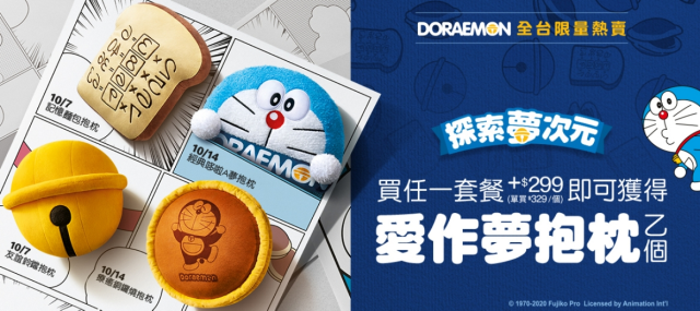 而這次為慶祝哆啦A夢 50 週年紀念,台灣麥當勞快樂兒童餐與《哆啦A夢》展開合作,推出 「2020 DORAEMON 愛作夢抱枕」全套共四款,限量 80,000 個,將於 10 月 7 日起至 11 月 3 日 全台限定開搶!售完為止!