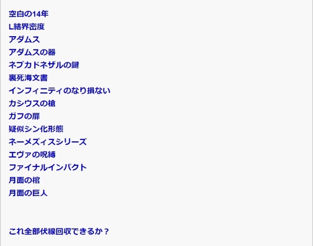 而也有網友表示最終章做 6 小時其實很合理,因為庵野秀明在前三部劇場版之中實在塞了太多的謎題,這位網友也將前三部劇場版中鋪的伏線都列了出來。