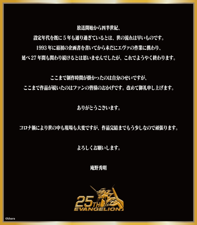 從動畫放送至今已經度過了四分之一個世紀,在當初設定的世界觀年代已經經過了 5 年,時光的流動真快呢。從 1993 年最初所寫的第一份企劃書到現在,我依舊在做著製作EVA的工作,我沒想到會持續參與這個企劃長達 27 年之久,但這也即將就要結束了。