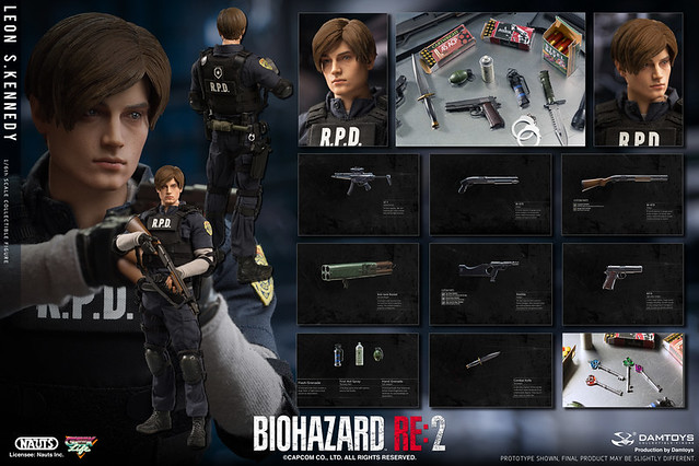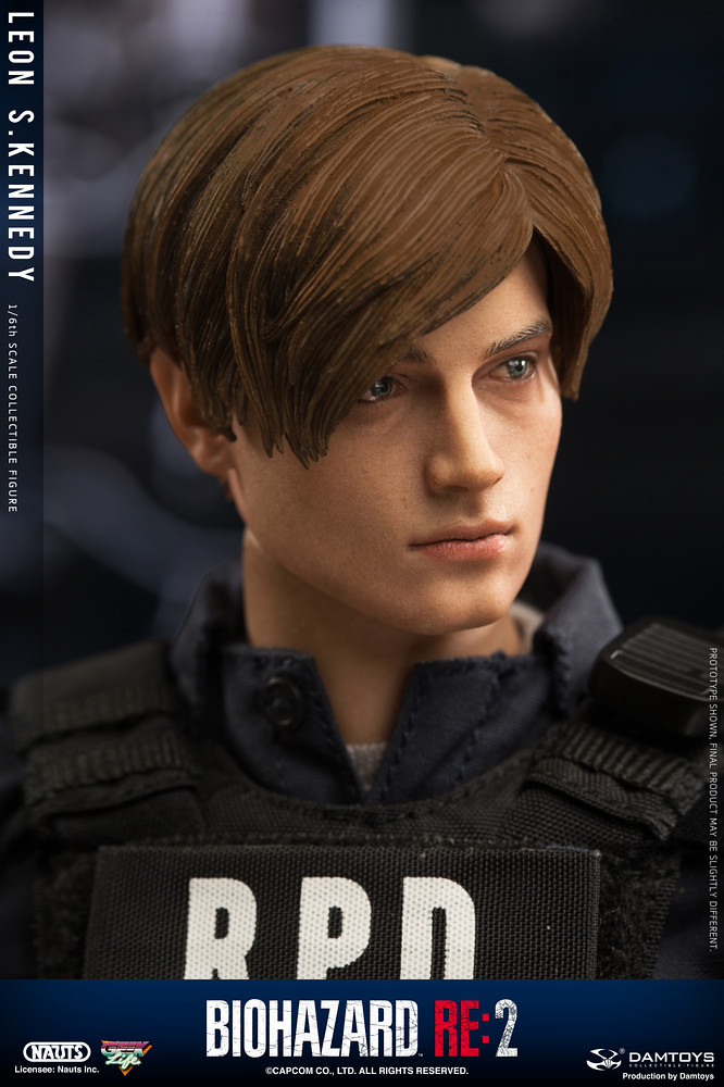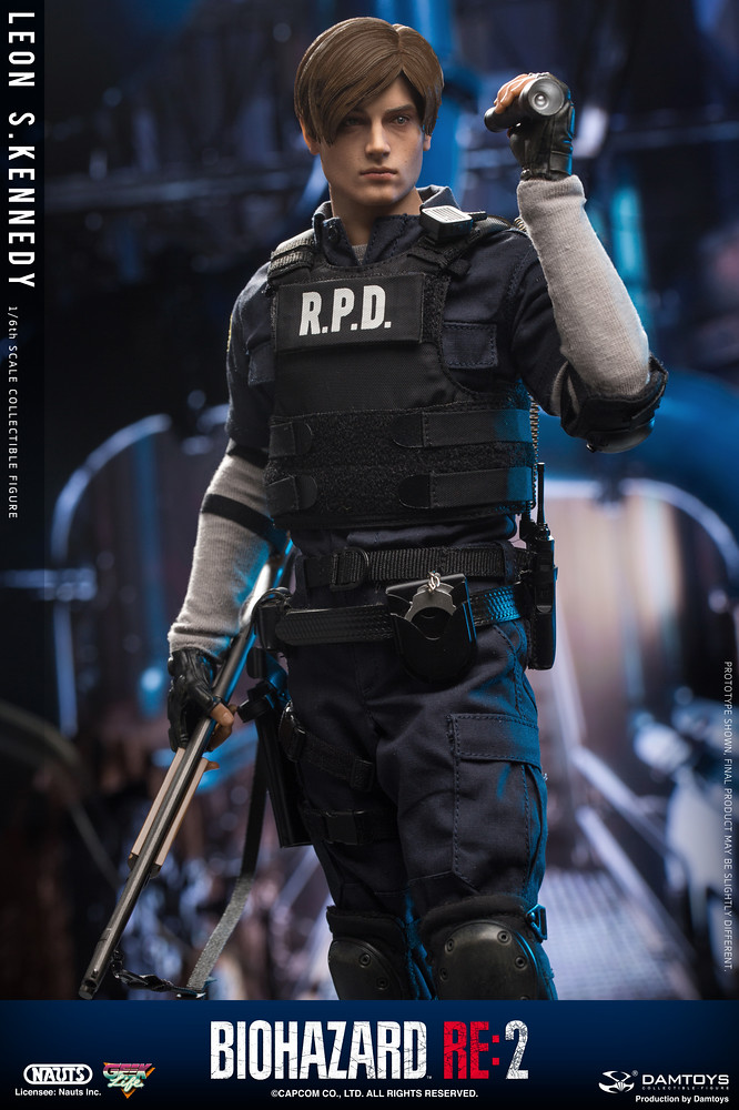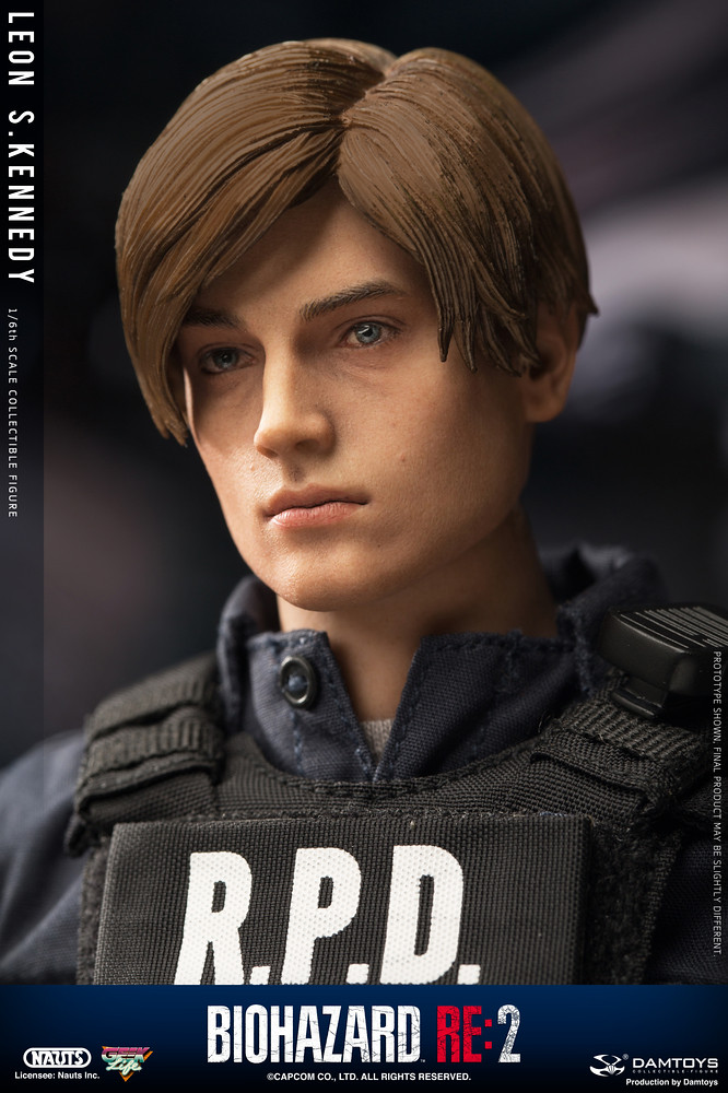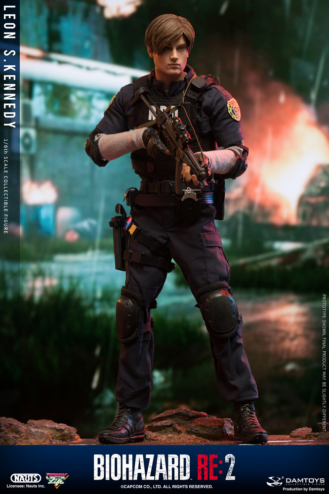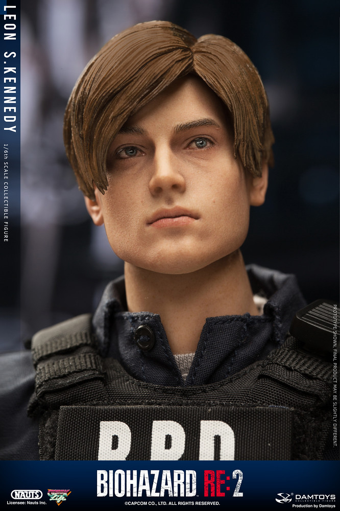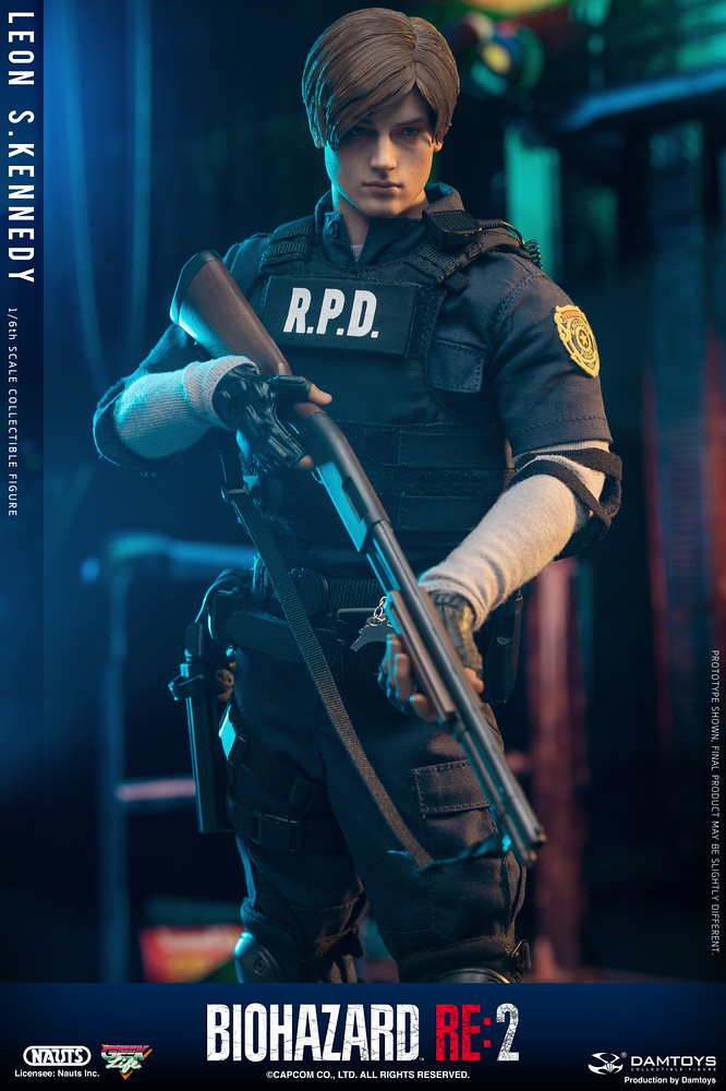 重製版的兩位主角,里昂和克蕾兒,都分別以新的模特兒做為人物模組之基準參考,里昂的造型是參考羅馬尼亞的模特兒「Eduard Badaluta」所建構而成,看得出臉型與以前的舊版本較為不同。這款 DAMTOYS 所製作的 1/6 里昂,高度約為 30 公分,造型就如同遊戲中他穿警察制服的樣子一般(不是復古款式),全身的可動關節有 30 處,能夠擺出各種多樣的生動姿勢。
