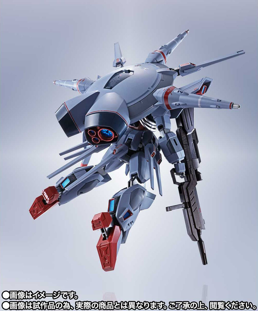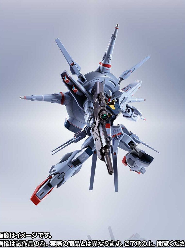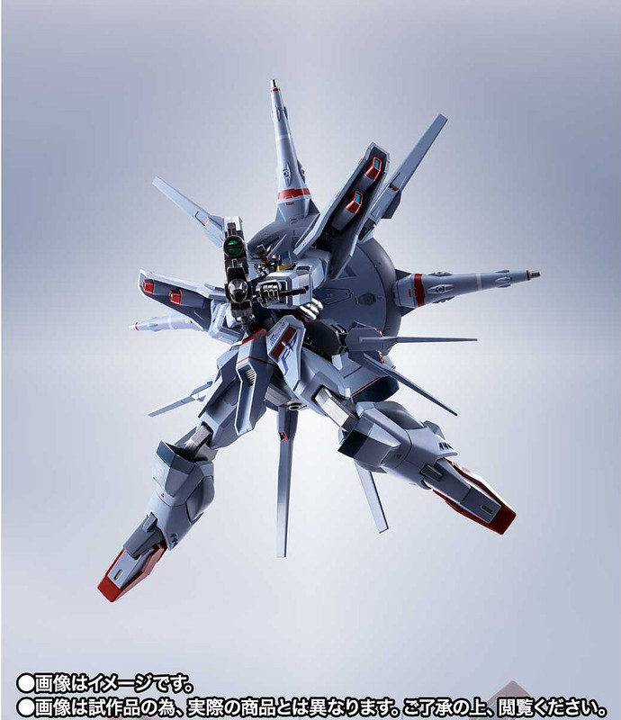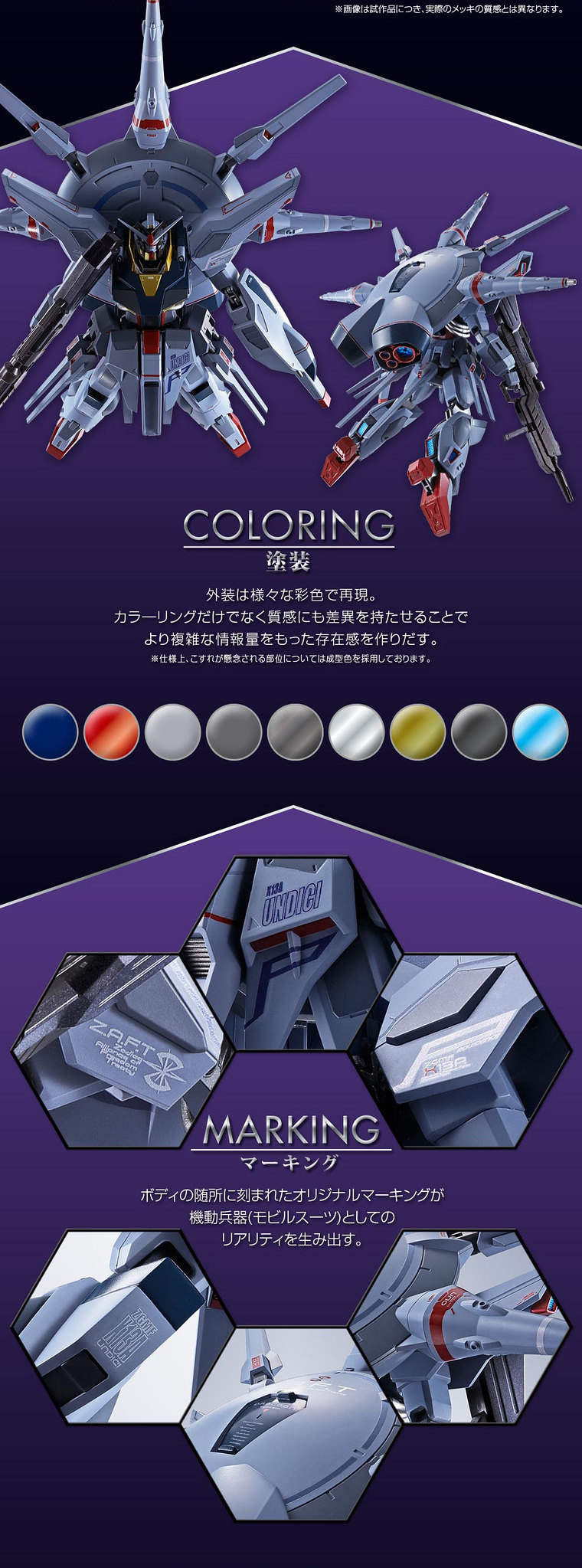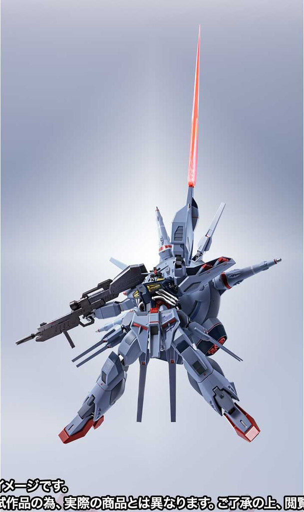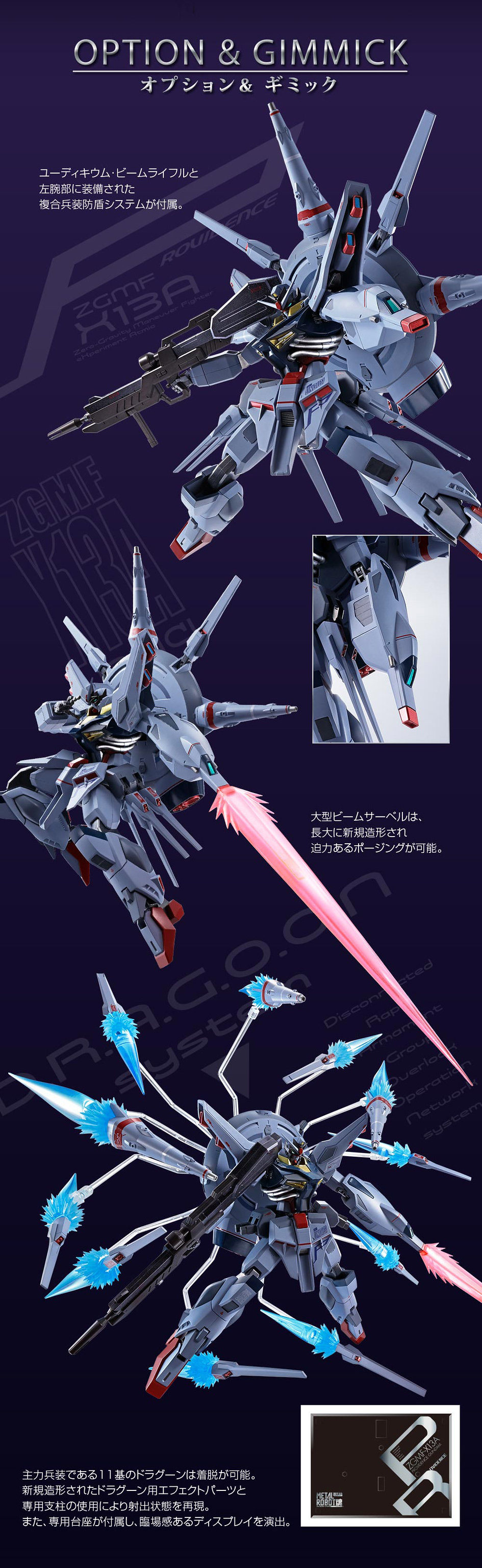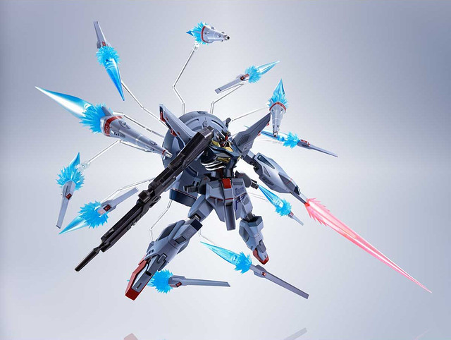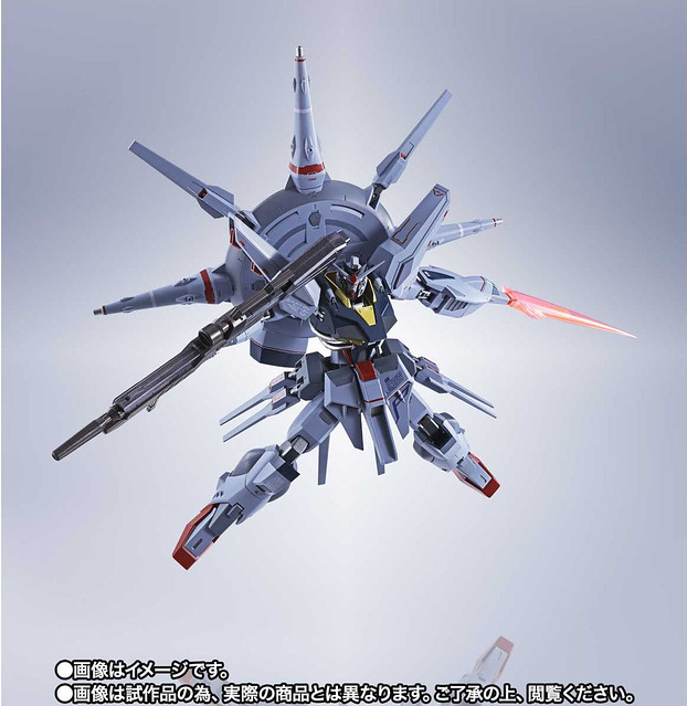 武裝部份收錄「審判式」大型光束步槍、搭載左腕的複合兵裝防盾系統,並附上新規造型的大型光束軍刀特效,比起 ROBOT 魂版的小牙籤氣勢大幅提昇!另外 11 組「龍騎兵系統」特效同樣採用新規造型製作,附有透明支架與黑銀色設計的專用台座。