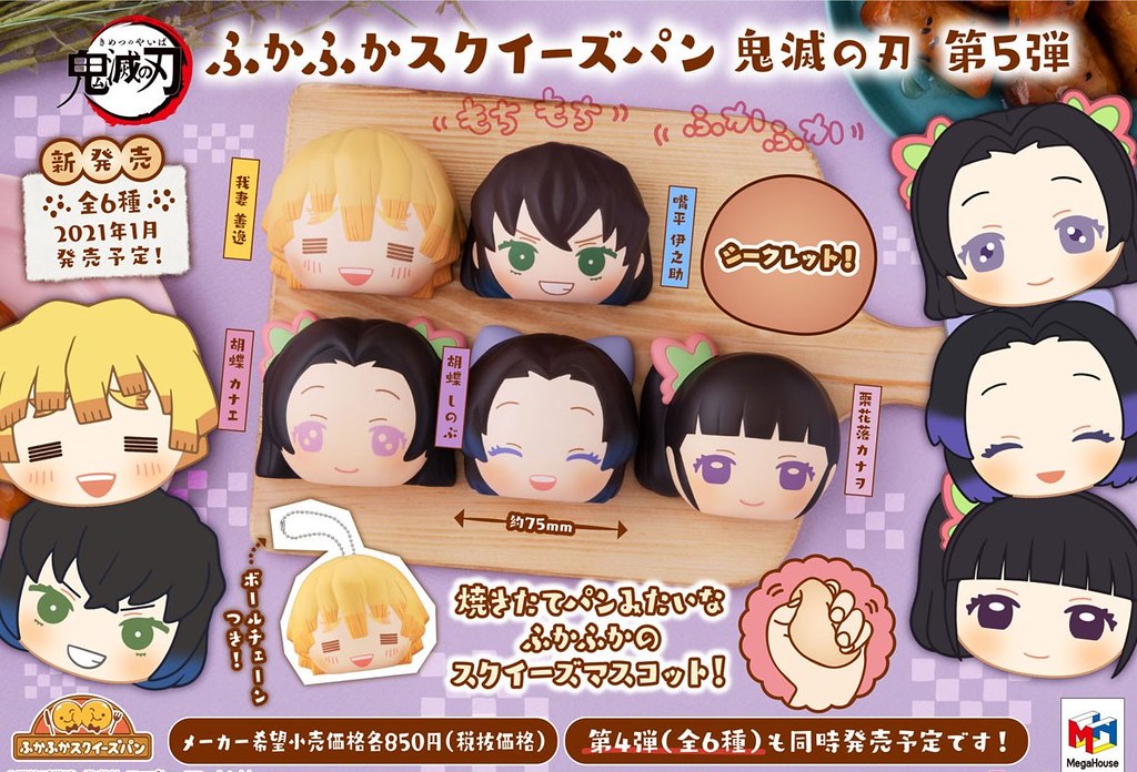 日本MEGAHOUSE公司(株式会社メガハウス)旗下療癒的「麵包造型捏捏樂」系列,將推出以大人氣動漫《鬼滅之刃》為主題的續作商品:「《鬼滅之刃》麵包造型捏捏樂 第五彈」(ふかふかスクイーズパン 鬼滅の刃 ),一共有六種款式,參考售價為各 850 日幣,預計將與第四彈共同於 2021 年 01 月發售。