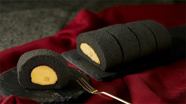 「無限列車奶油捲」 以列車漆黑的外表設計,將蛋糕體製作成黑色的外觀,內藏的奶油則是以地瓜製成,食用後富有飽足感。售價為 181 日圓。