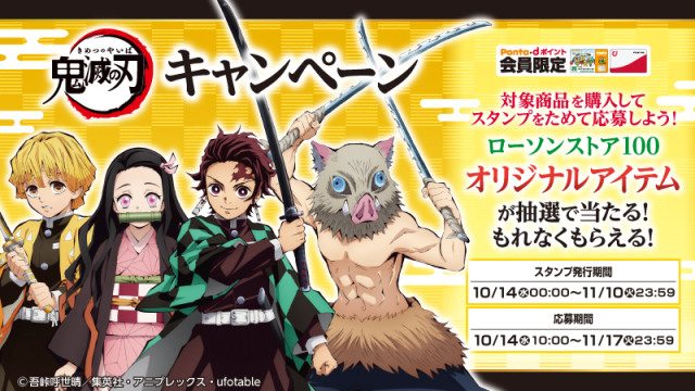Lawson也將於 10 月 14 日開始合作的活動,活動期間凡持有 Ponta 卡或 dポイント卡購買指定商品,可以累積點數。點數可以換取許多《鬼滅之刃》的原創商品,眾多的周邊等你收集~詳情請見合作官方網頁。