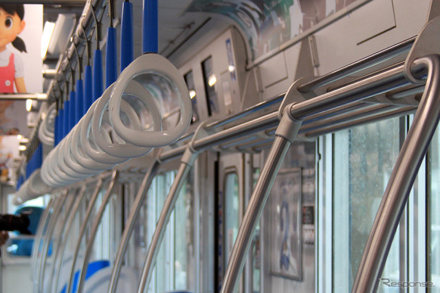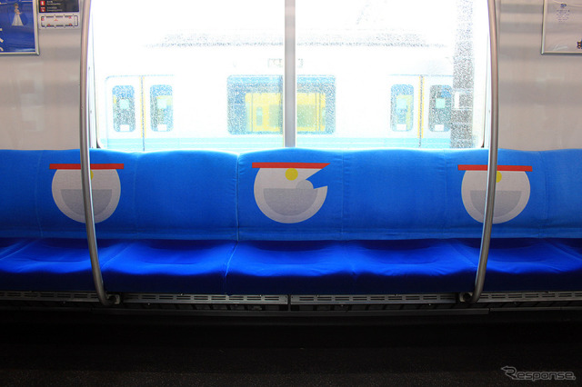 在這趟旅途中,除了可以欣賞「哆啦藍」的電車外觀外,車內包含座椅、隔板、甚至是拉環…等,更是滿滿哆啦A夢在電車裡四處探頭,並頭戴著竹蜻蜓在觀望著你,守護著你的乘車安全。