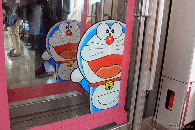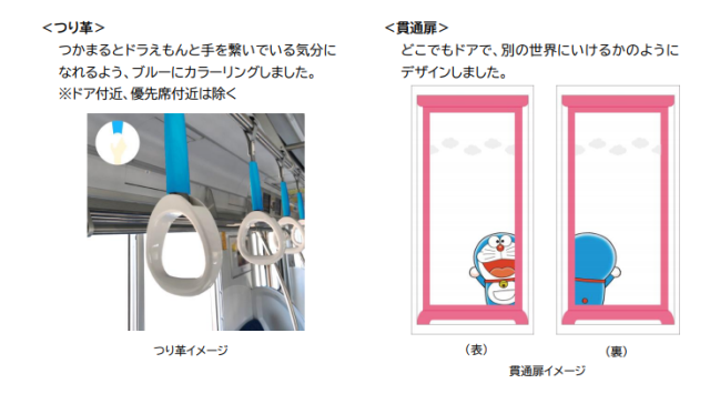 ▼就連電車裡的門也特別以秘密道具「任意門」作為設計,而且正面與背面也都有不同的哆啦A夢圖案