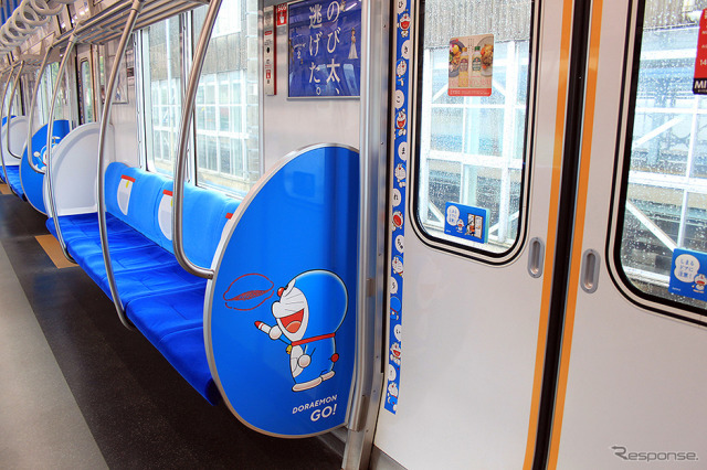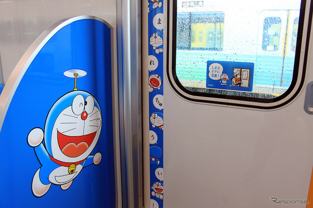 且為了因應即將在11月上映的哆啦A夢電影《STAND BY ME 哆啦A夢2》 ,在車內更是滿滿大雄與靜香從小到長大結婚的宣傳海報,讓你在乘坐這班電車時也不能忘記在11月20日這天要前往戲院見證這場世紀婚禮這件事。