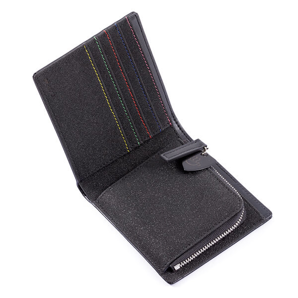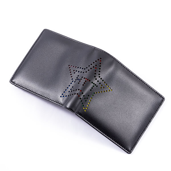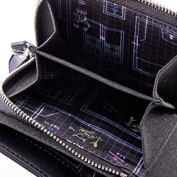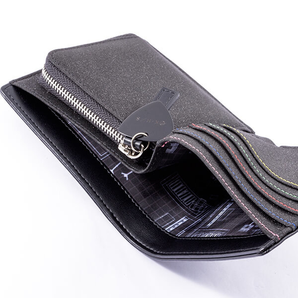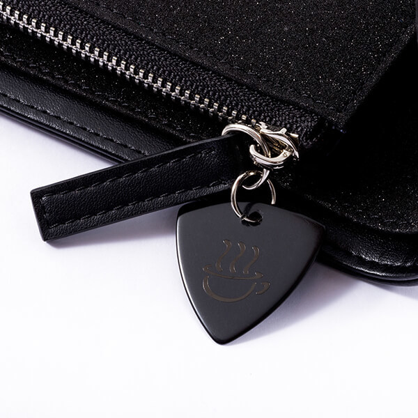 與背包雷同的設計,以黑色為基底,低調閃爍的星星為主設計。內裏也有與背包一樣的花紋襯布,放置卡片與證件的夾層有著代表角色色系的縫線,配上拉鍊上的 Pick 吊飾,十分具有 K-ON 的味道。