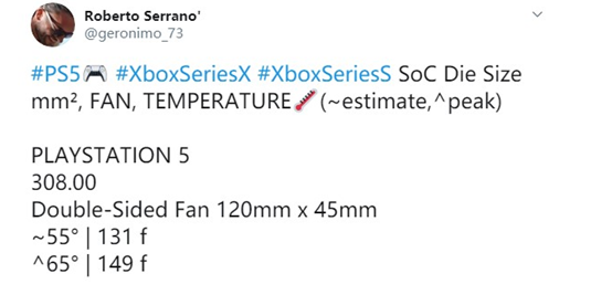 Roberto Serrano'本次以「PS5」、「XSX」、「XSS」做比較,之前的體積與現在的價格都已經在市場明瞭,但對於部分效能實測與溫度、散熱有待更多採樣。本次實驗結果發現性能最低的「XSS」SoC單晶片系統至少在120*14mm的風扇下維持47-58℃低溫。